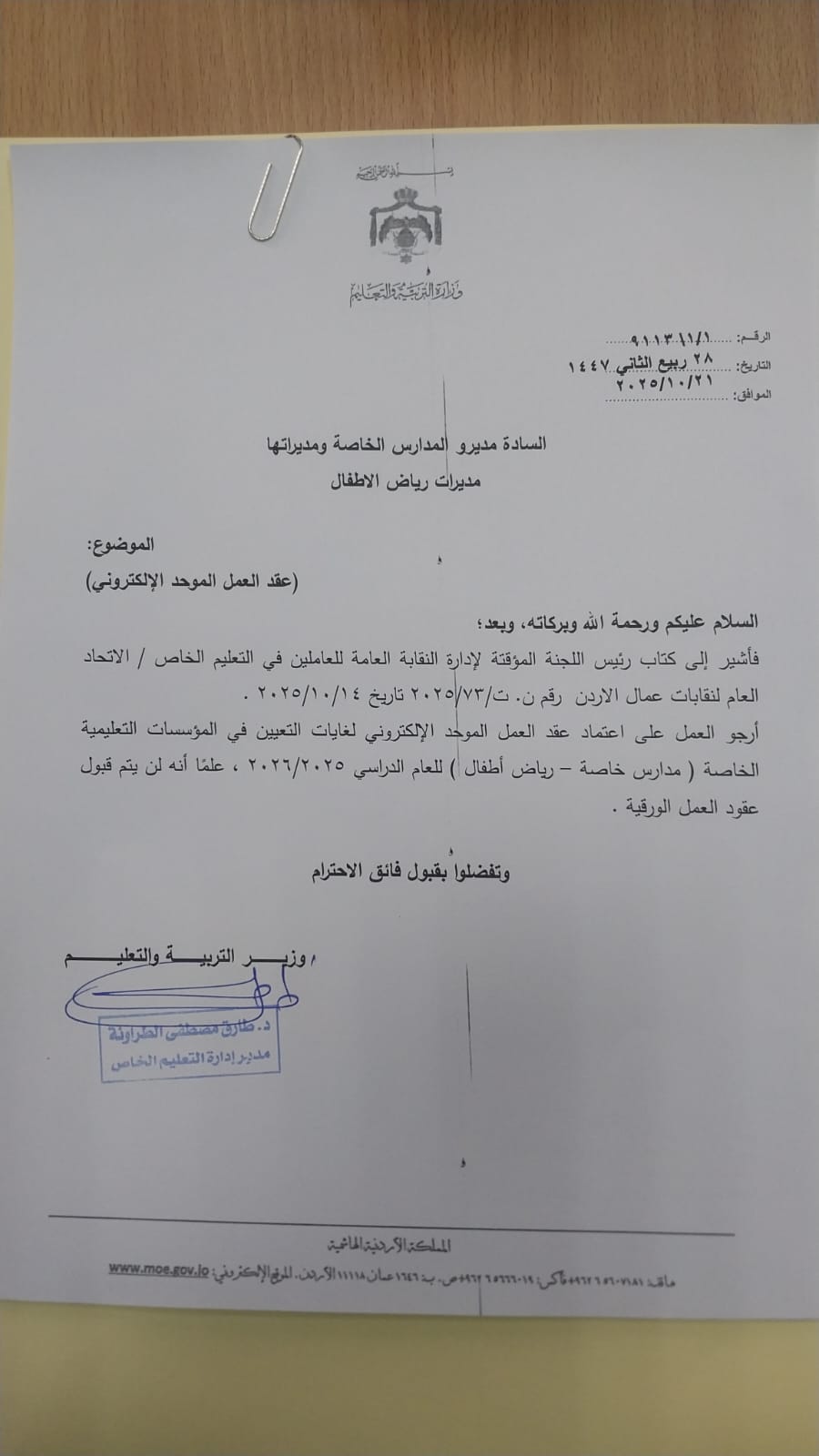 عمم وزير التربية والتعليم، الدكتور عزمي محافظة، على مديري المدارس الخاصة ومديرياتها، باعتماد عقود العمل الموحدة الإلكترونية لغايات التعيين في المؤسسات التعليمية الخاصة (مدارس خاصة، ورياض أطفال) للعام الدراسي 2025/ 2026، ولن يتم قبول عقود العمل الورقية.