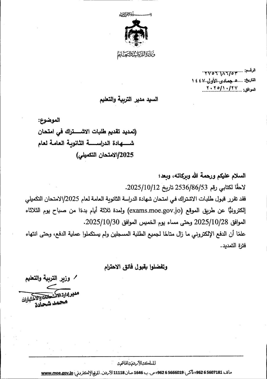 وأوضحت الوزارة أن فترة التمديد ستستمر لمدة ثلاثة أيام، ابتداءً من صباح يوم الثلاثاء الموافق 28 تشرين الأول 2025، وحتى مساء يوم الخميس الموافق 30 تشرين الأول 2025، من خلال الموقع الإلكتروني للوزارة (exams.moe.gov.jo).