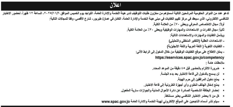 دعت عدد من الدوائر الحكومية في الأردن مئات المرشحين ممن تقدموا بطلبات توظيف عبر ديوان الخدمة المدنية إلى التواجد يوم الخميس الموافق 6/11/2025 الساعة 12 ظهراً، لحضور اختبار التنافسي الإلكتروني.