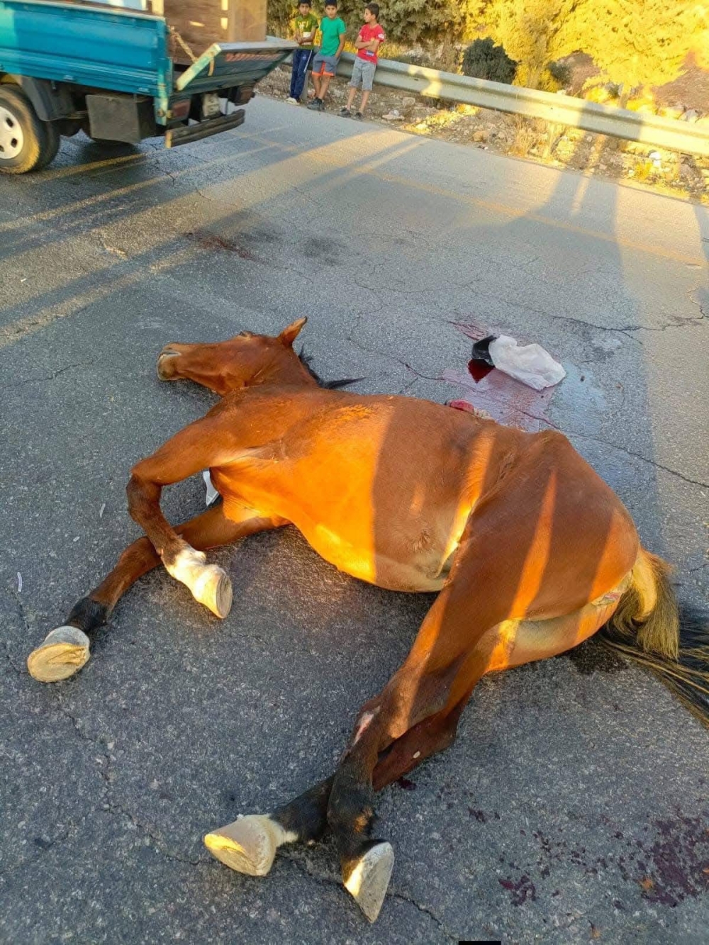 نفوق حصان إثر حادث اصطدام على شارع الستين في السلط (صور)