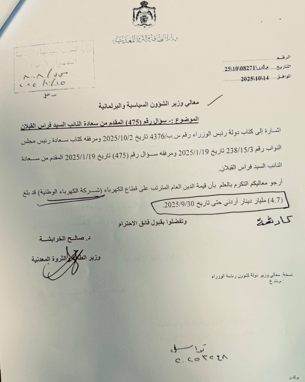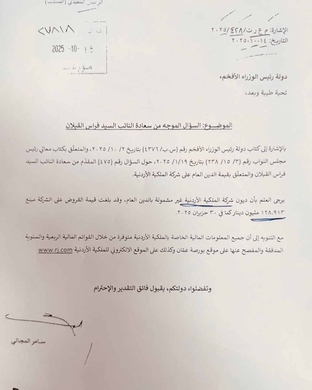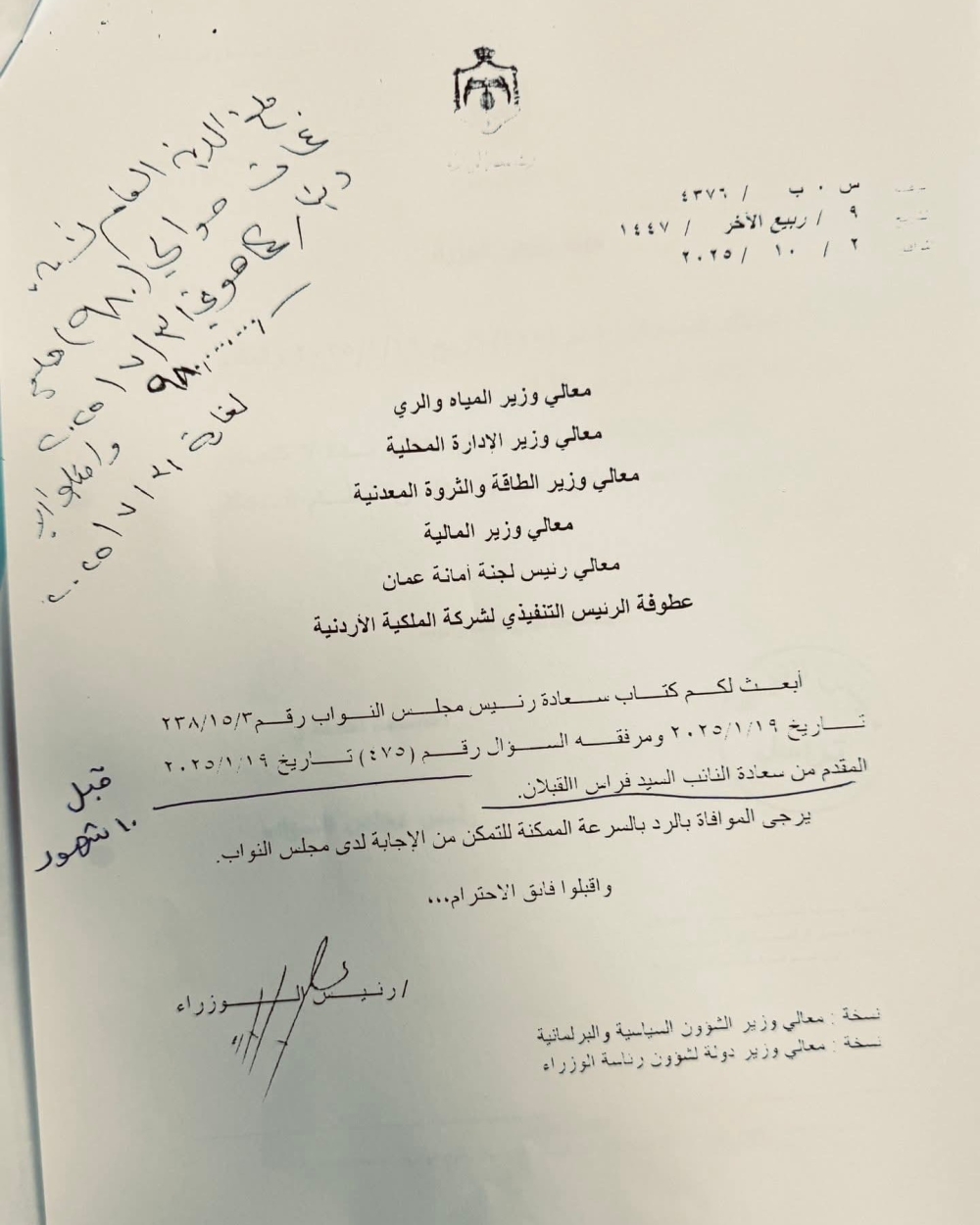 قال النائب فراس القبلان إن الرد الحكومي على سؤاله النيابي رقم 475 حول قيمة الديون العامة للمؤسسات الحكومية والهيئات المستقلة والمستشفيات الحكومية والعسكرية وشركات الكهرباء والمياه وأمانة عمّان والبلديات، جاء بعد نحو عشرة أشهر، مبينا أن الرد وصل فقط من أربع جهات.