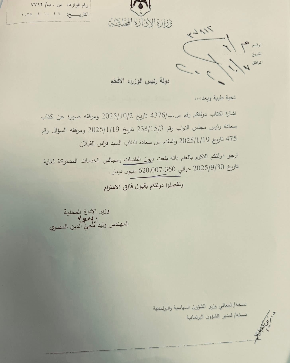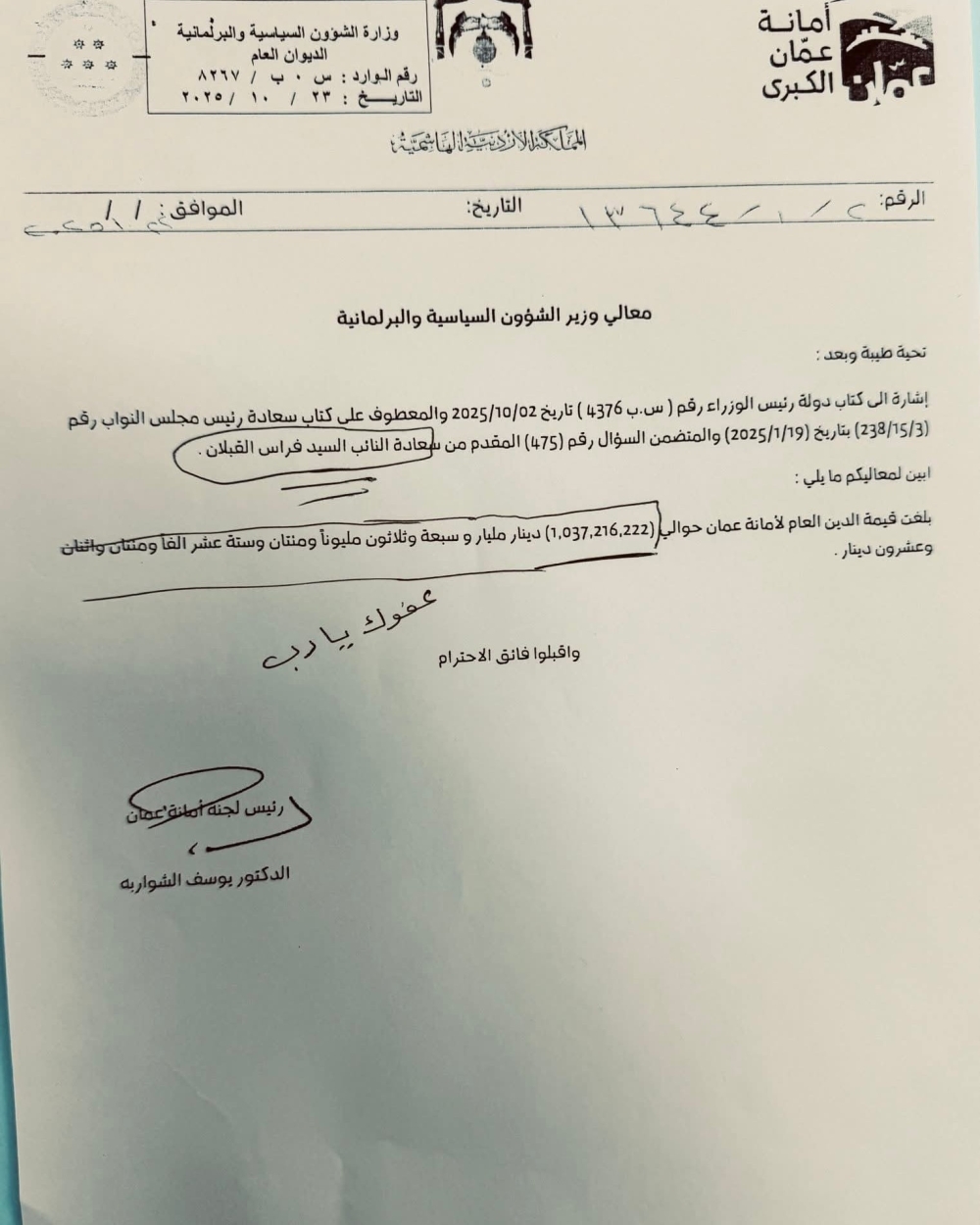 وأوضح القبلان أن البلديات ومجالس الخدمات المشتركة أفادت بأن الدين العام لها يبلغ 620 مليون دينار، وأمانة عمّان الكبرى مليار و37 مليونا و216 ألف دينار، وشركة الكهرباء الوطنية بلغت ديونها 4.7 مليار دينار فقط، وبقية المؤسسات لم تقدم أي رد حتى الآن.