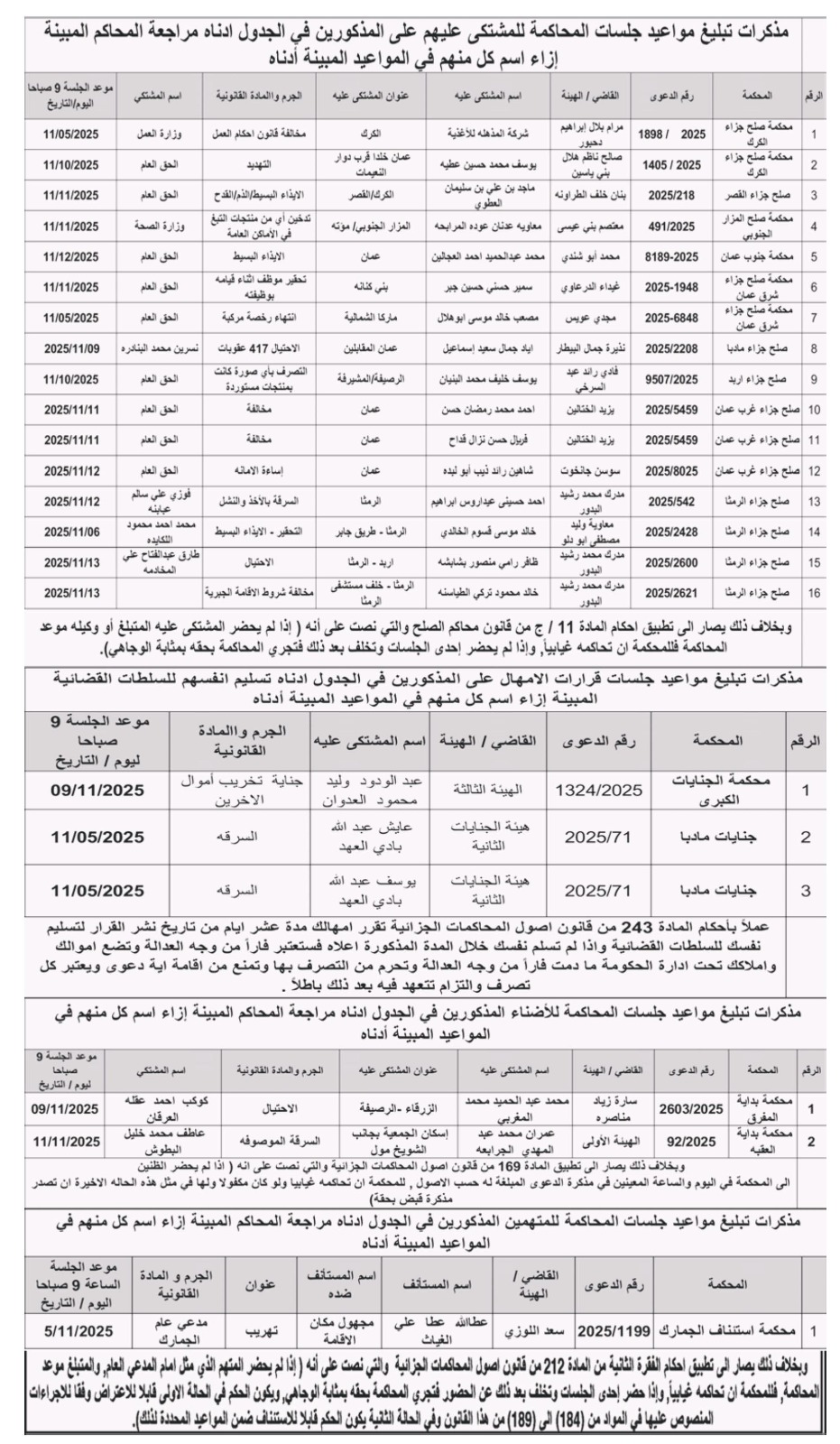 صدرت في الصحف اليوم الاثنين مذكرات تبليغ بمواعيد جلسات محاكمة لمشتكى عليهم ولمتهمين ولأظناء وقرارات إمهال.