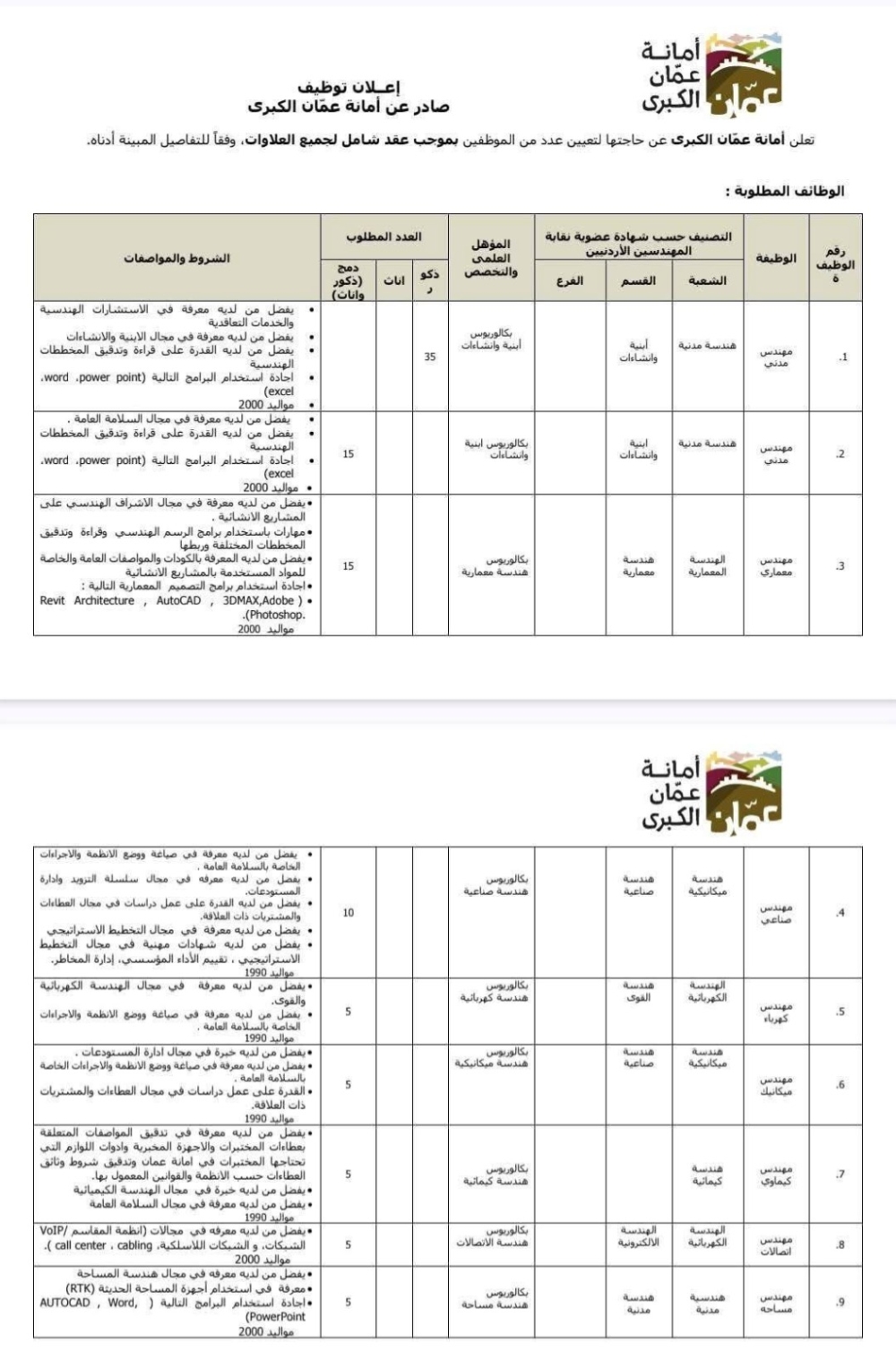 وجاء في الإعلان الذي اطّلعت عليه صحيفة "اخبار الأردن" الإلكترونية أن الأمانة تطلب تعيين عددٍ من المهندسين في تخصصات المدنية، والمعمارية، والميكانيكية، والكهربائية، والصناعية، وغيرها، بشرط أن يكون المتقدّم من مواليد عام 2000، وأن يمتلك خبرات عملية محددة تتعلّق بالاستشارات الهندسية أو إدارة المشاريع أو إعداد المخططات، فضلًا عن إجادة استخدام برامج التصميم الهندسي المتقدمة.