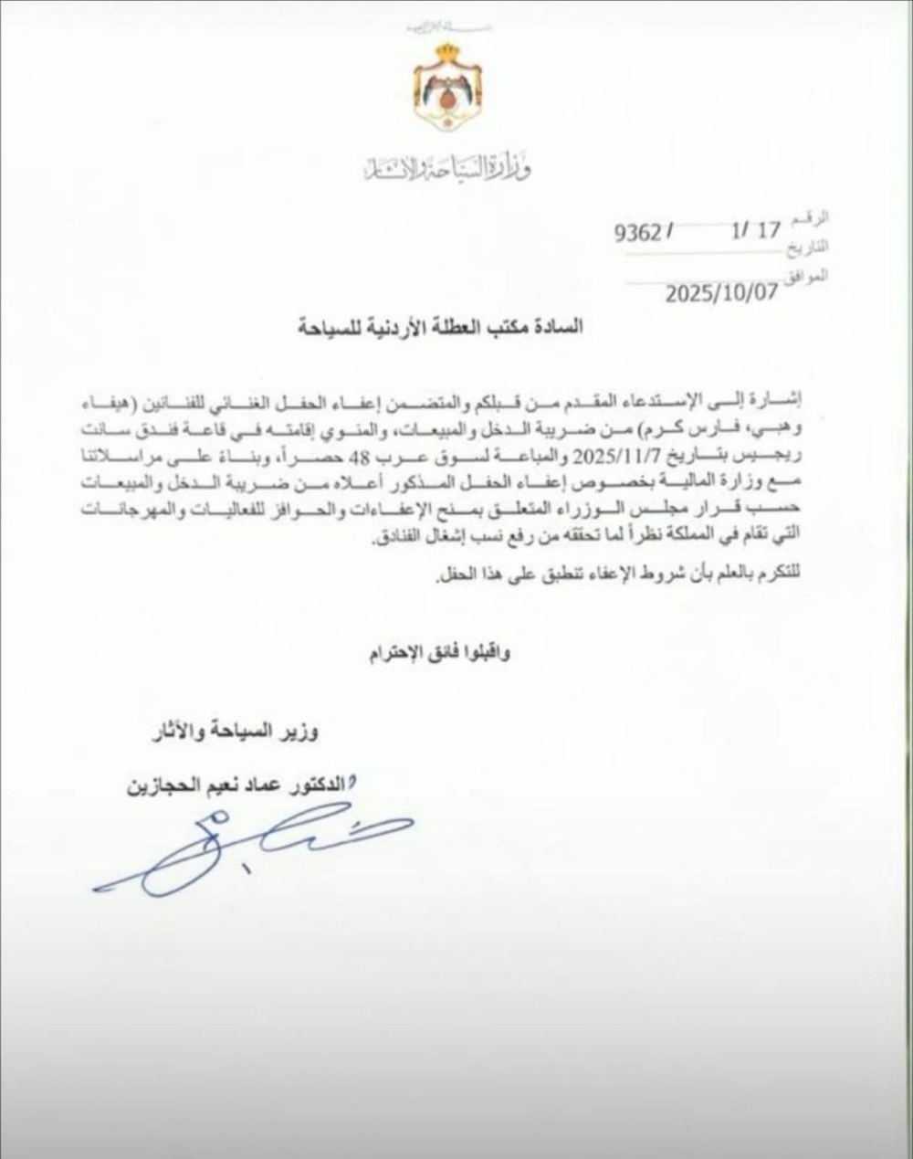 وتساءل الحنيطي عن أسباب منح هذا الإعفاء، في الوقت الذي تتعذر فيه الحكومة عن تقديم إعفاءات ضريبية للمشاريع الاقتصادية ، التي تسهم في جذب الاستثمار وخلق فرص عمل، مشيرا إلى أن تذكرة الحفل تجاوز سعرها 500 دينار.