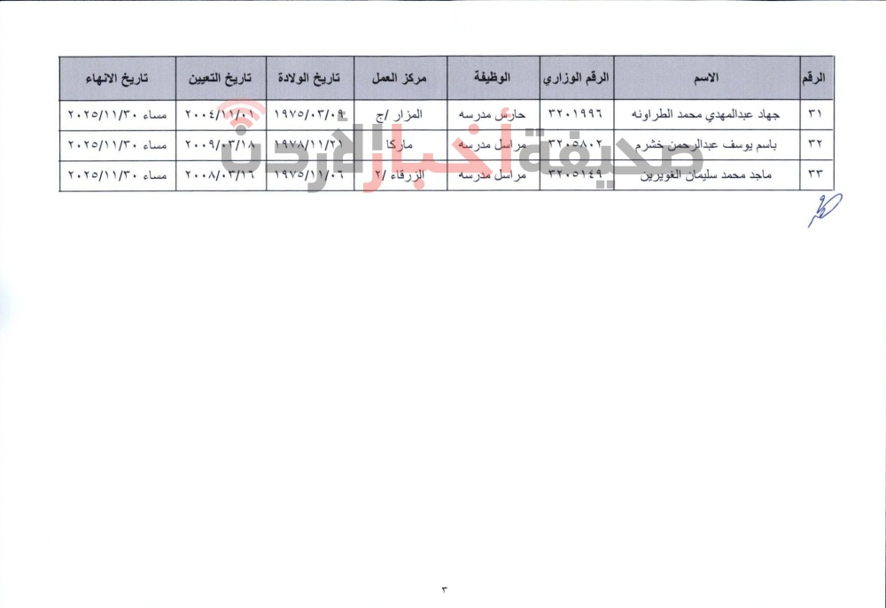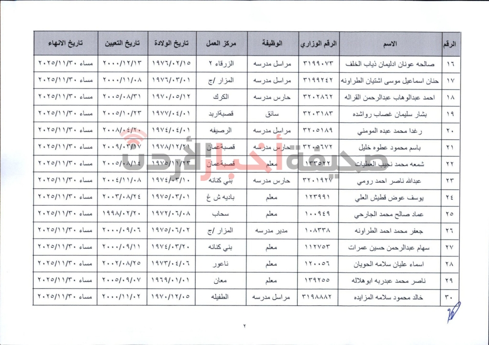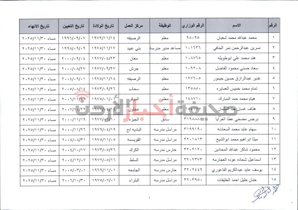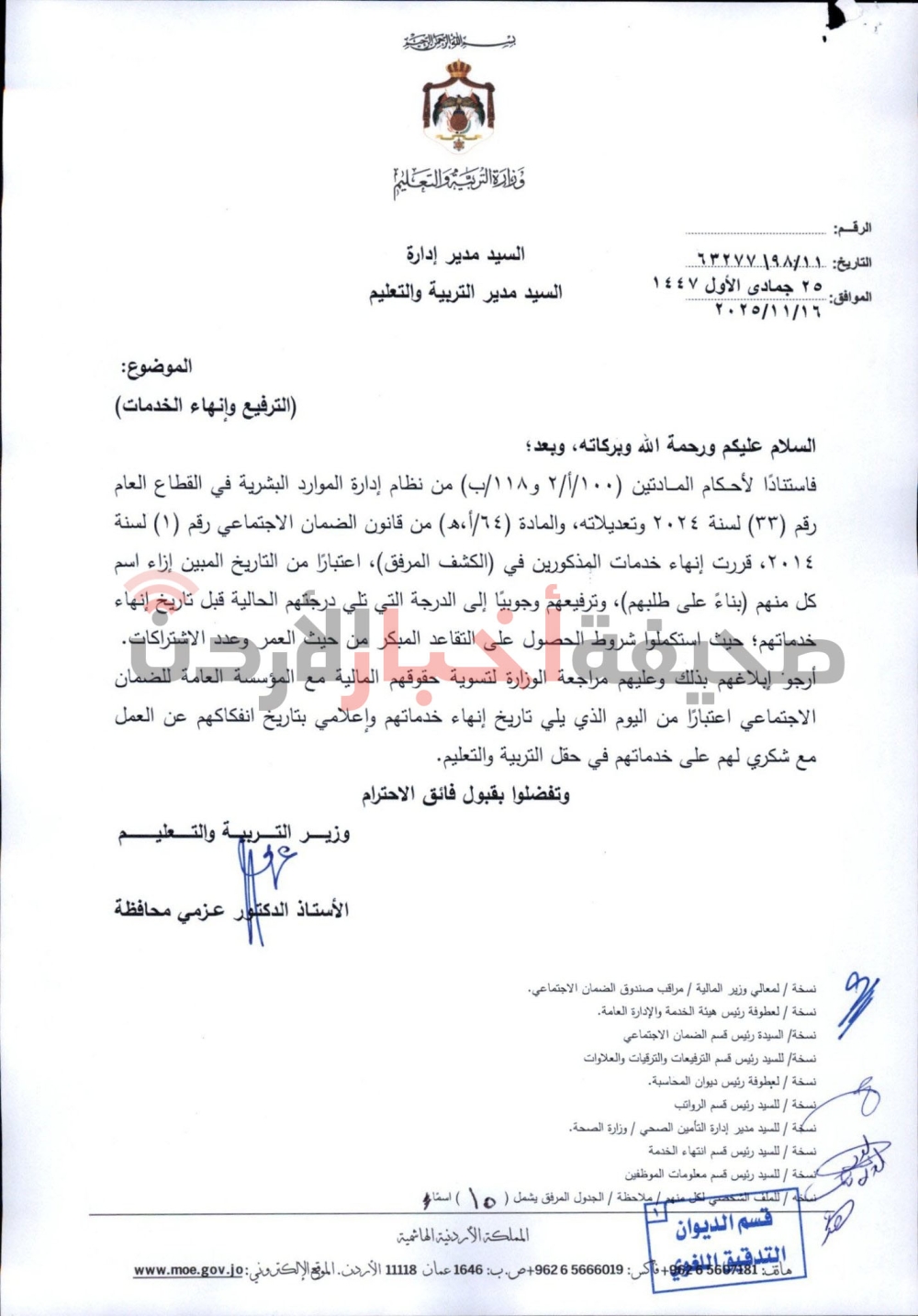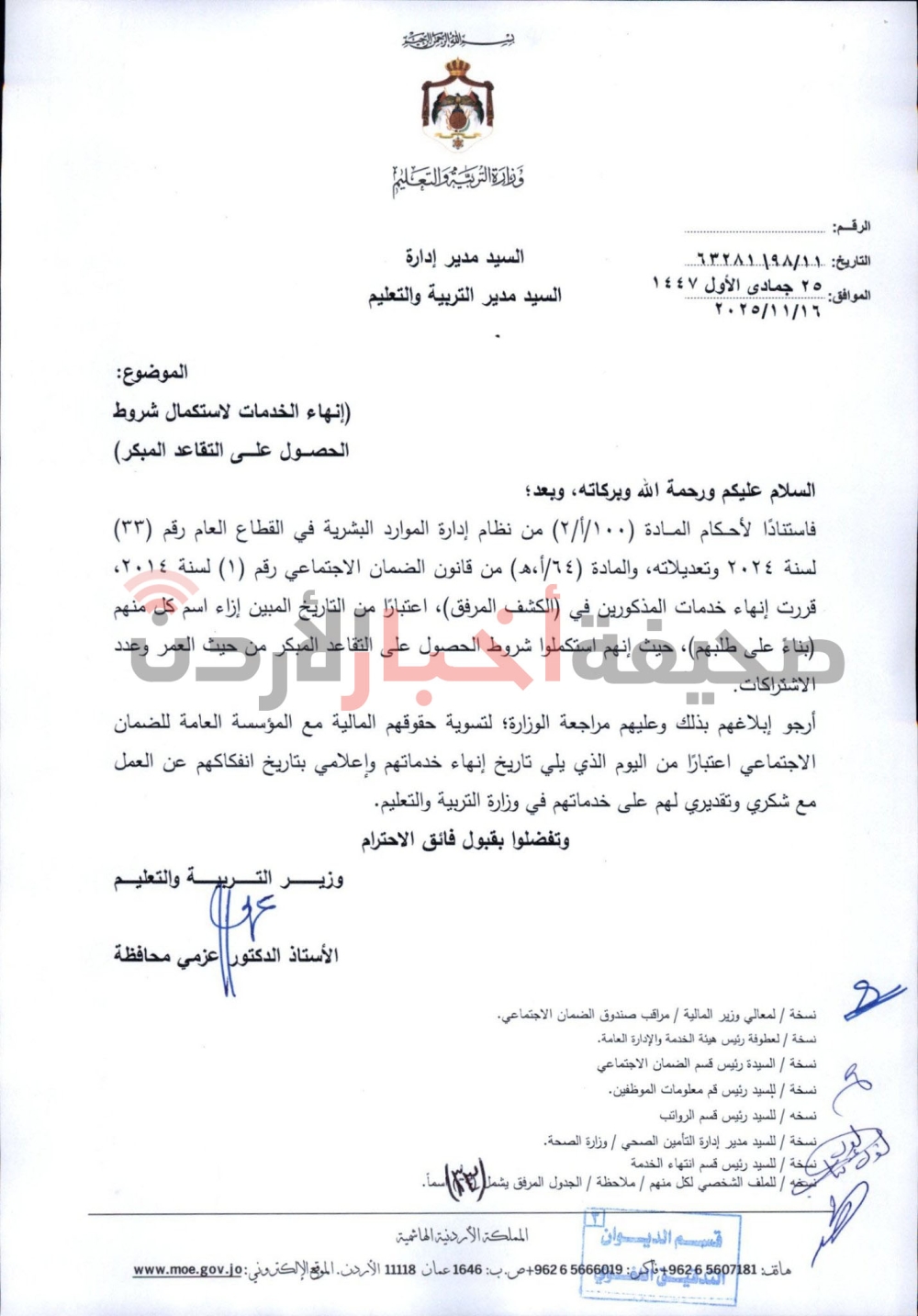 قرر وزير التربية والتعليم الدكتور عزمي محافظة، إنهاء خدمات عدد من الموظفين في الوزارة لاستكمالهم شروط الحصول على التقاعد المبكر من حيث العمر وعدد الاشتراكات.
