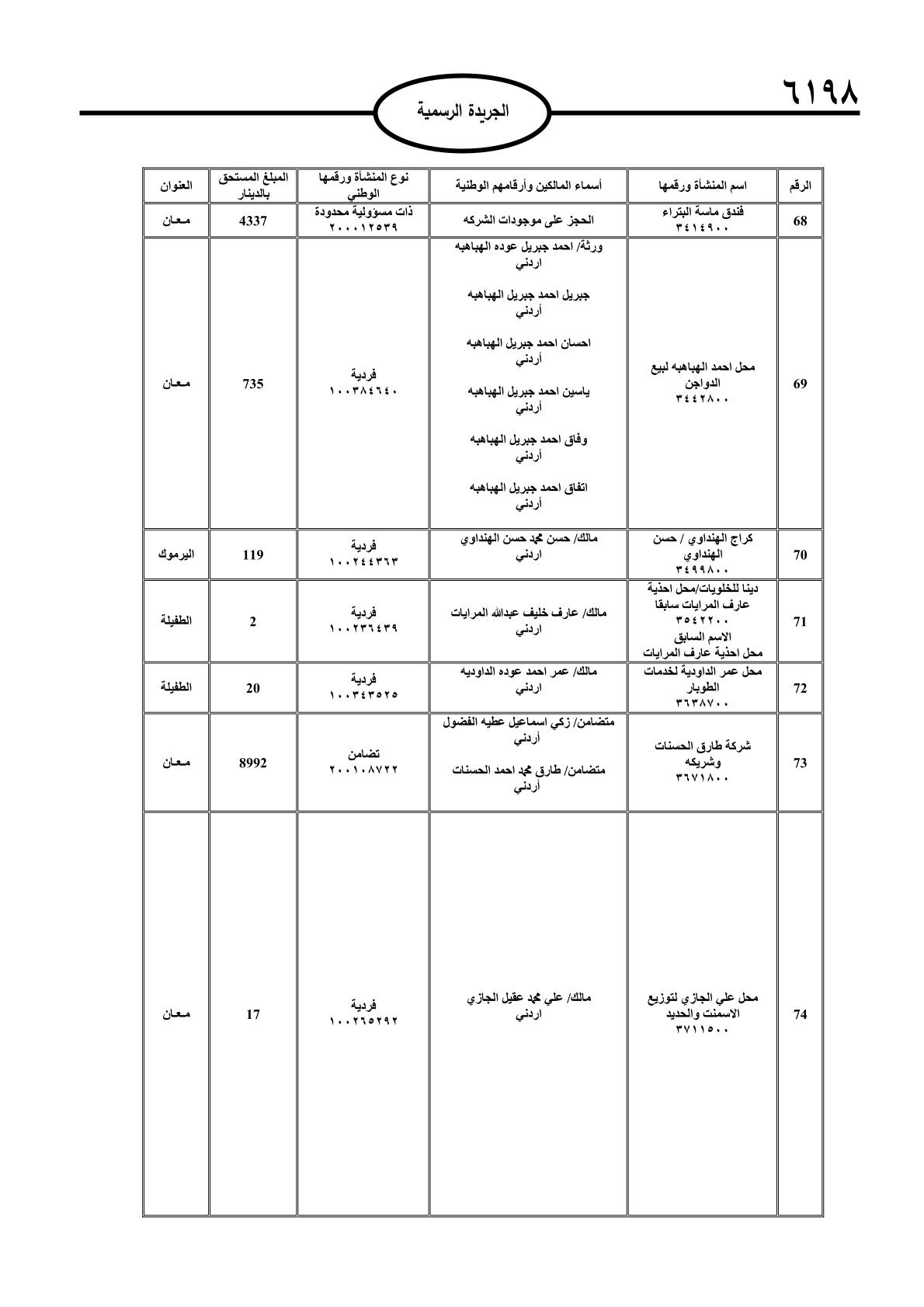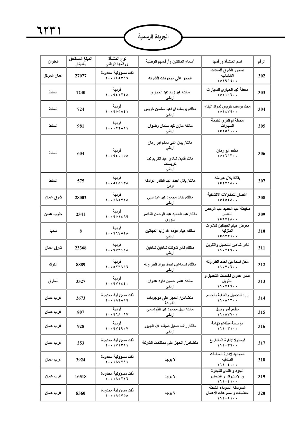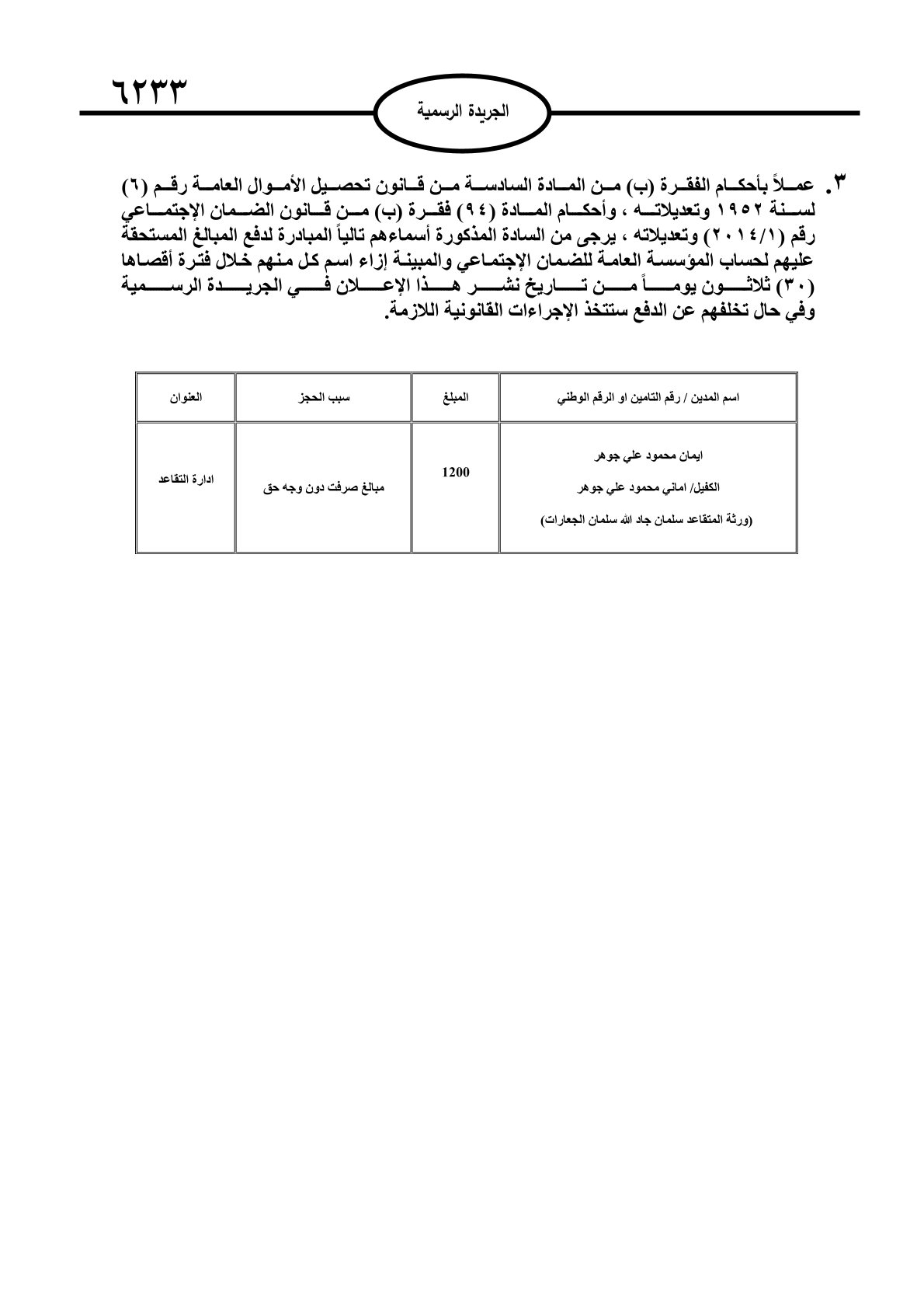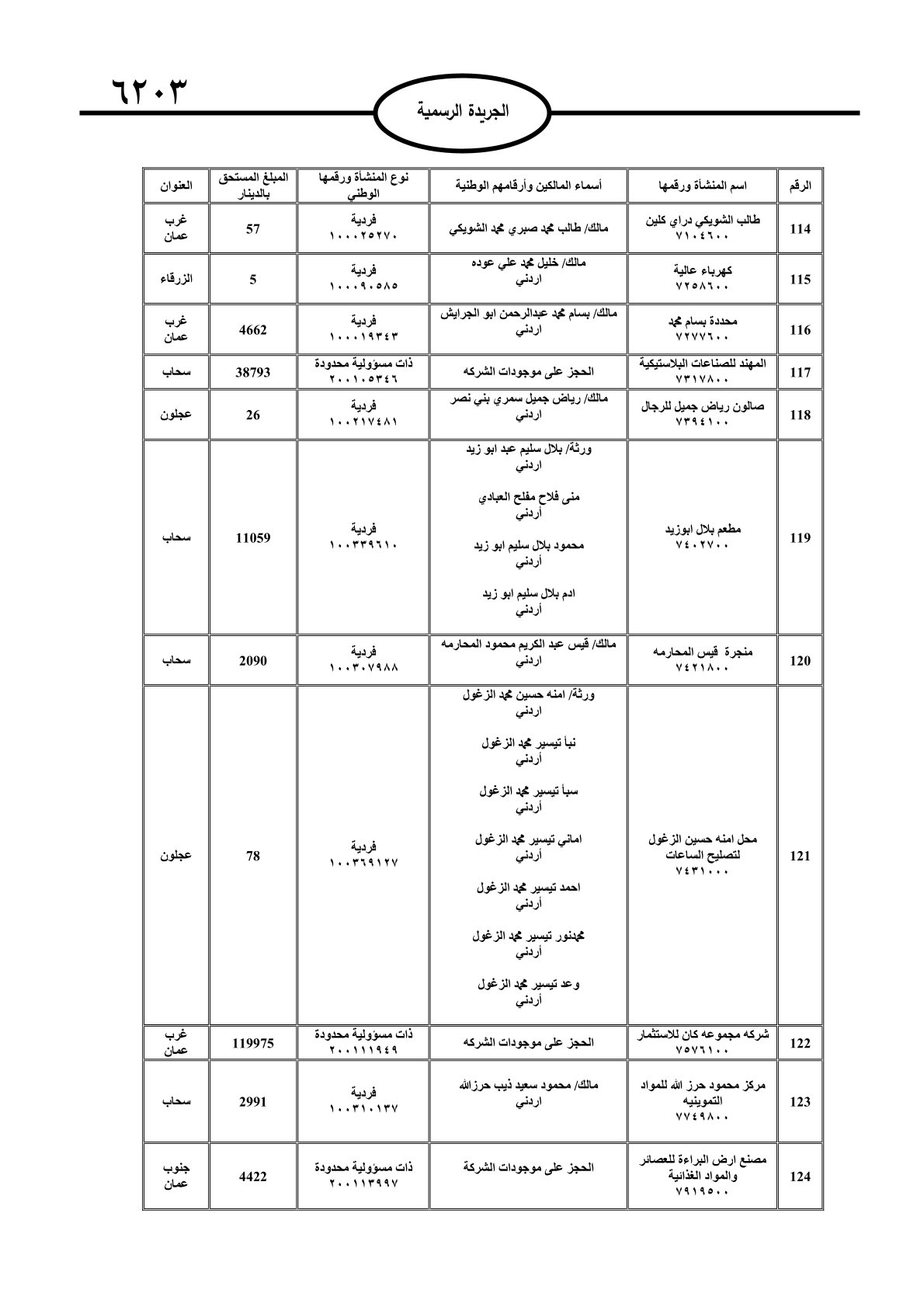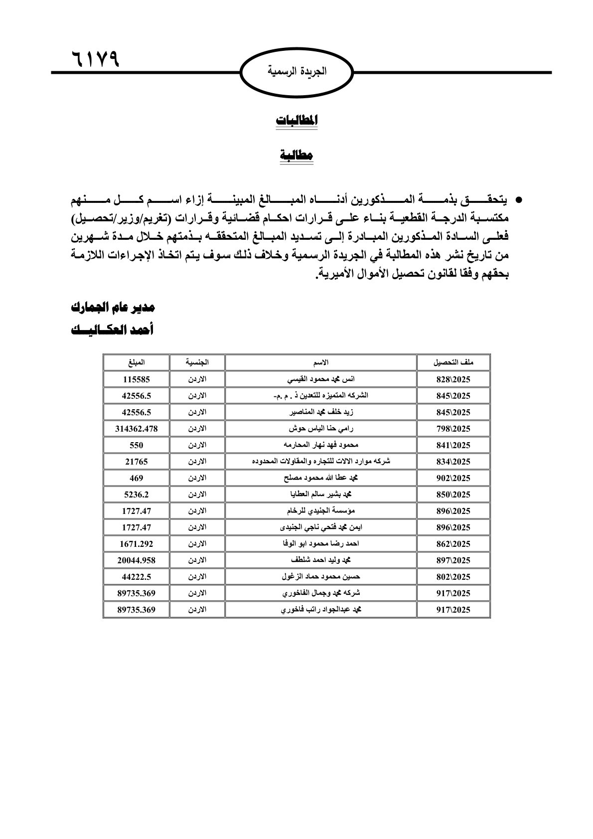 عملا بأحكام قانون تحصيل الأموال العامة، نشرت الجريدة الرسمية الصادرة اليوم الأحد قوائم مطالبات مالية بحق مئات الأردنيين.