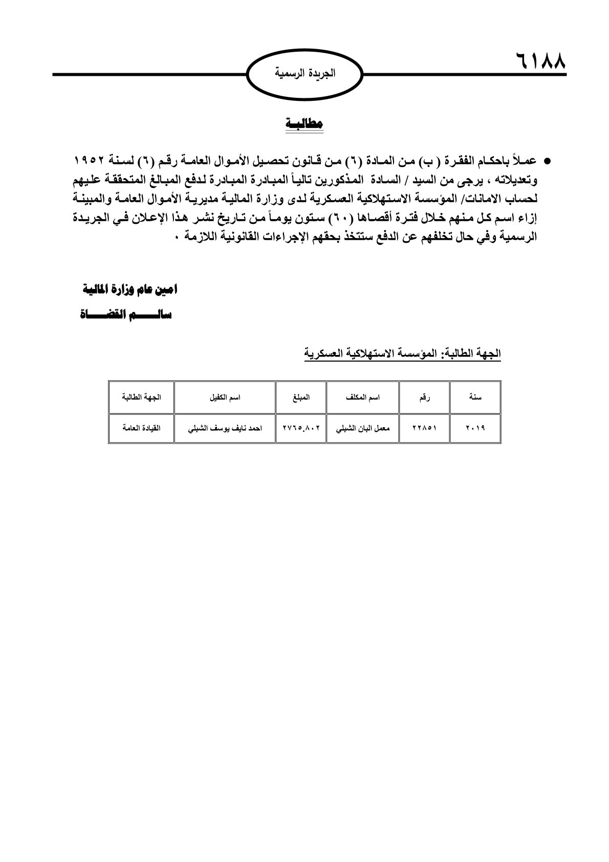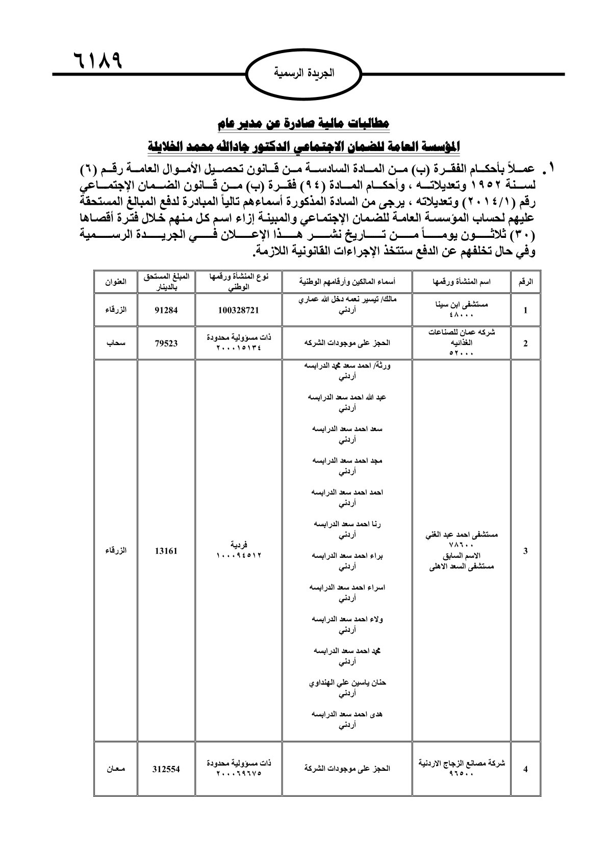 وصدرت هذه المطالبات عن عدد من الجهات الرسمية، من بينها دائرة الجمارك وصندوق التنمية والتشغيل والمؤسسة الاستهلاكية العسكرية والمؤسسة العامة للضمان الاجتماعي.