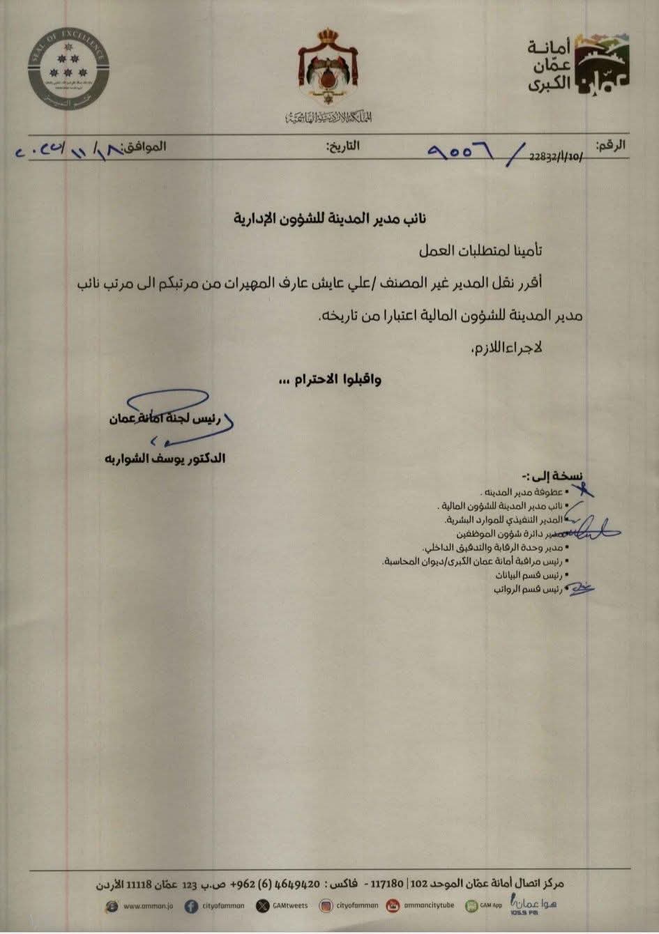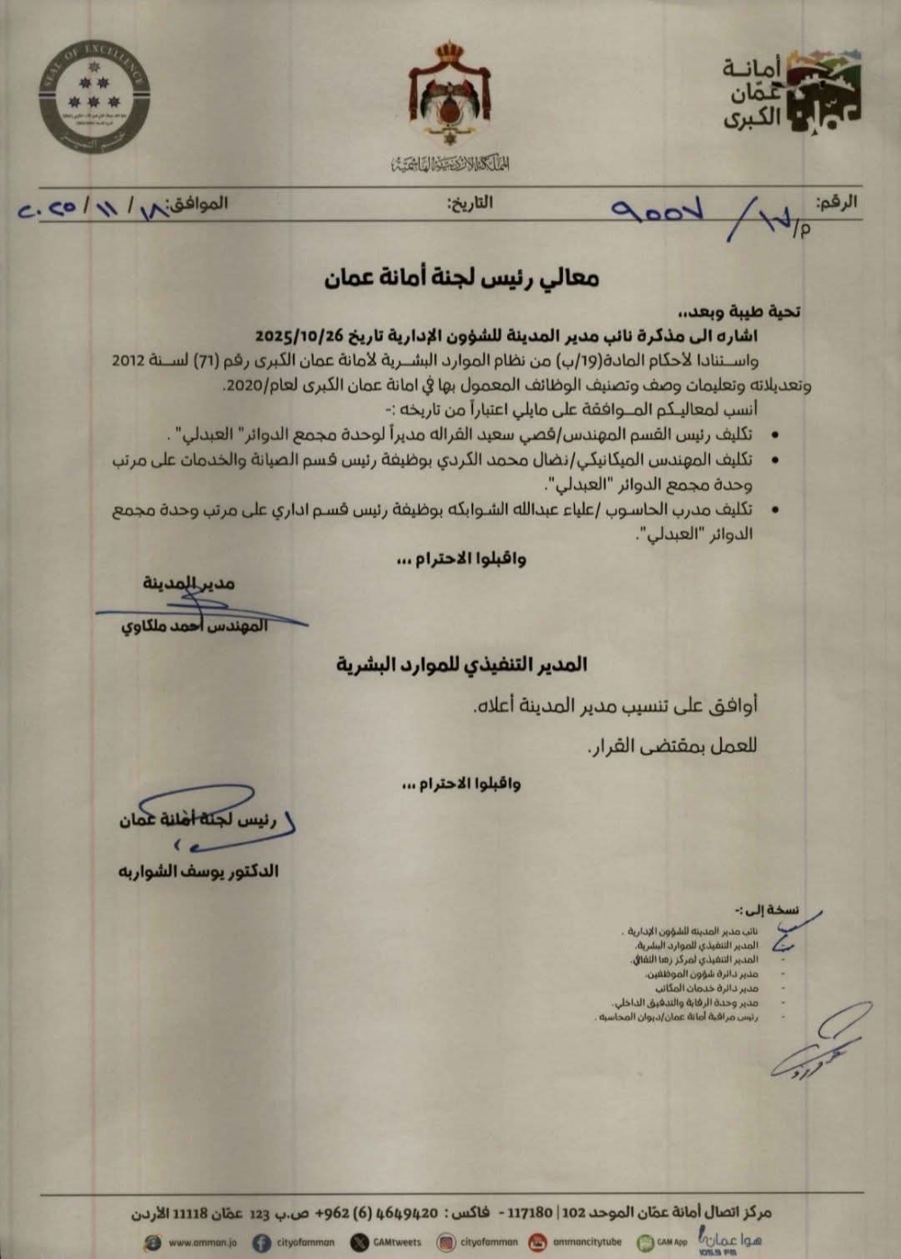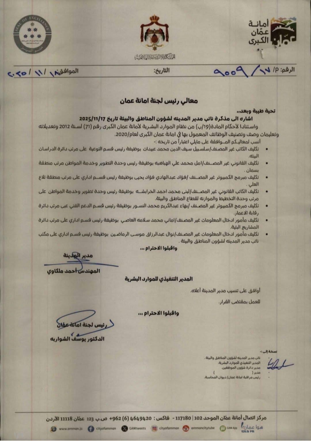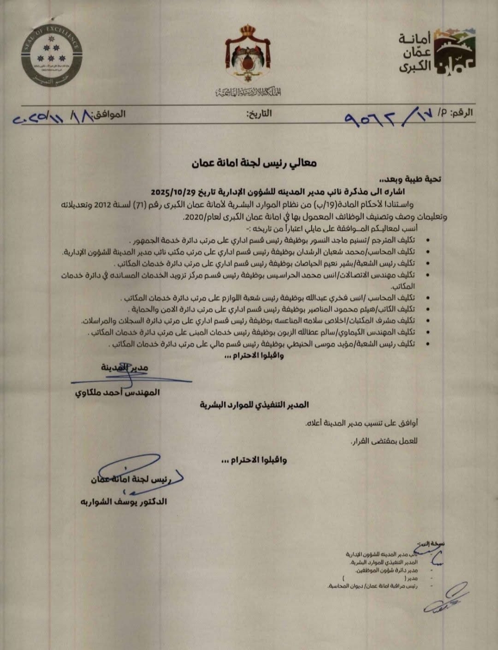 قرر رئيس لجنة أمانة عمان الكبرى الدكتور يوسف الشواربة الموافقة على تنسيب مدير المدينة المهندس أحمد ملكاوي، على نقل مسؤولين وتكليف آخرين بأعمال محددة.