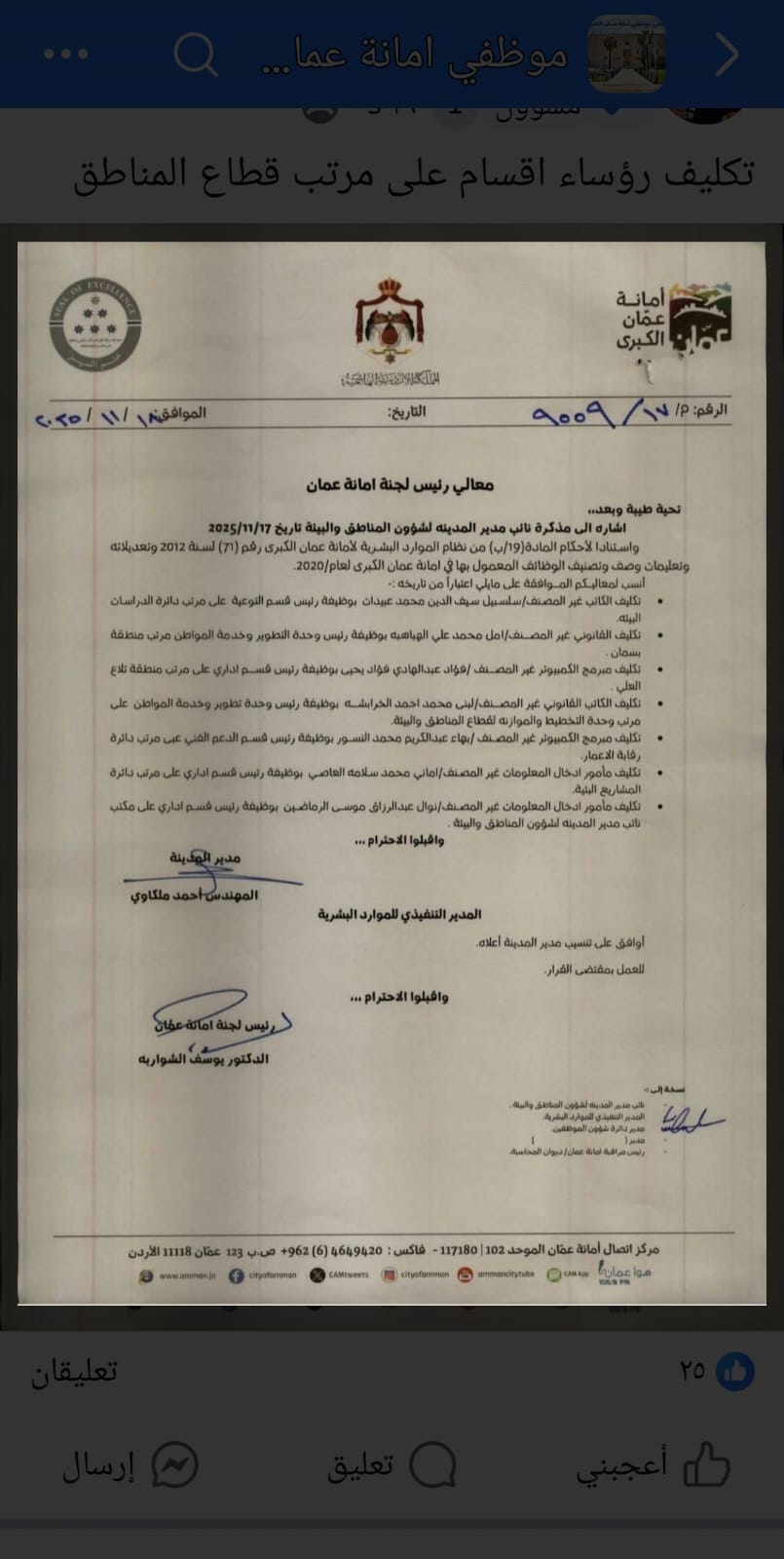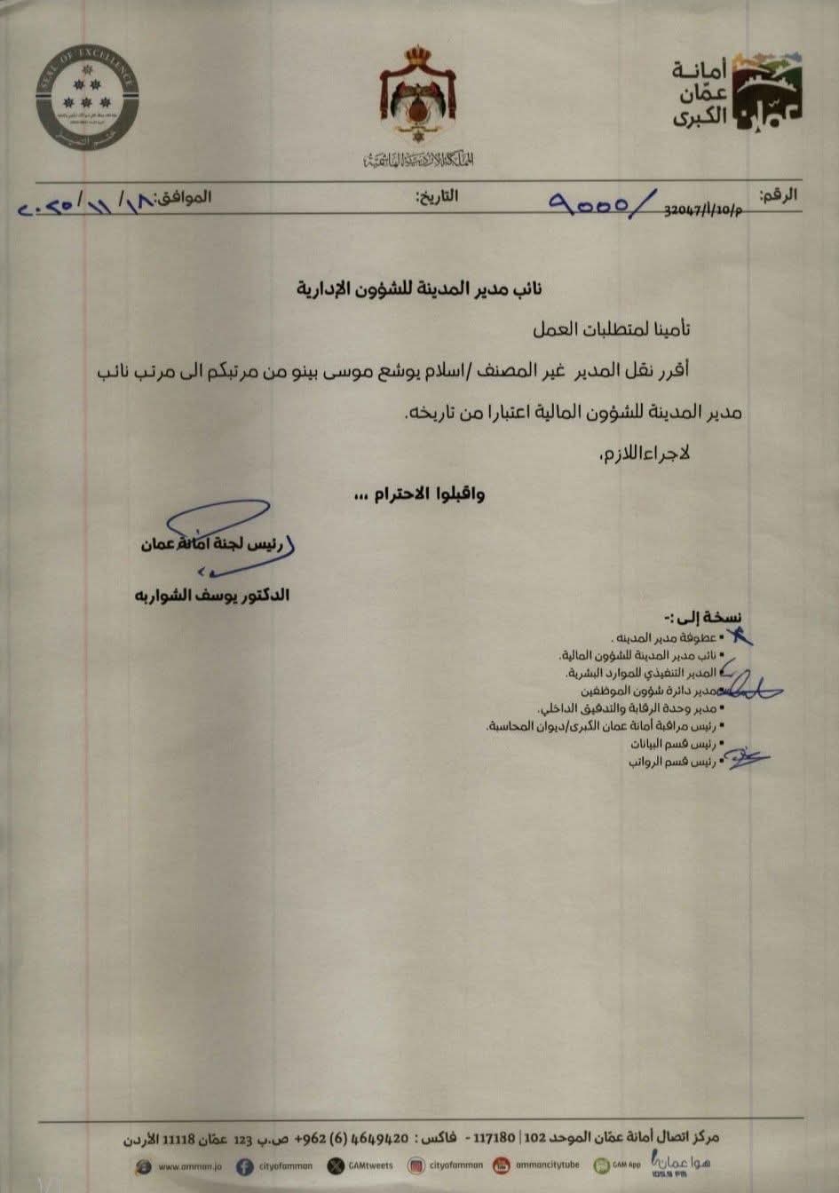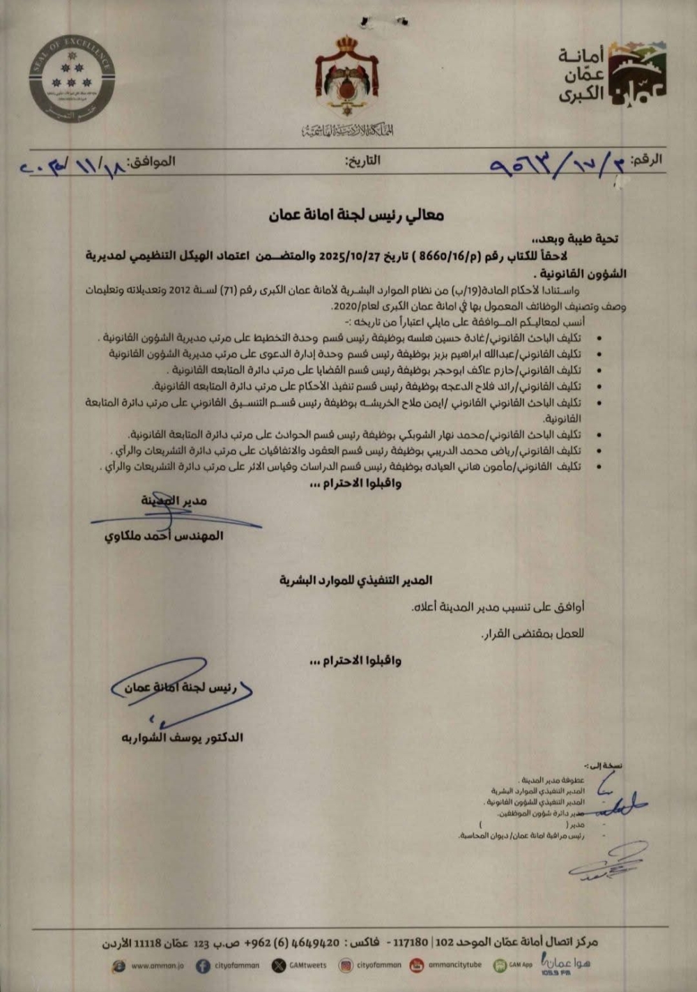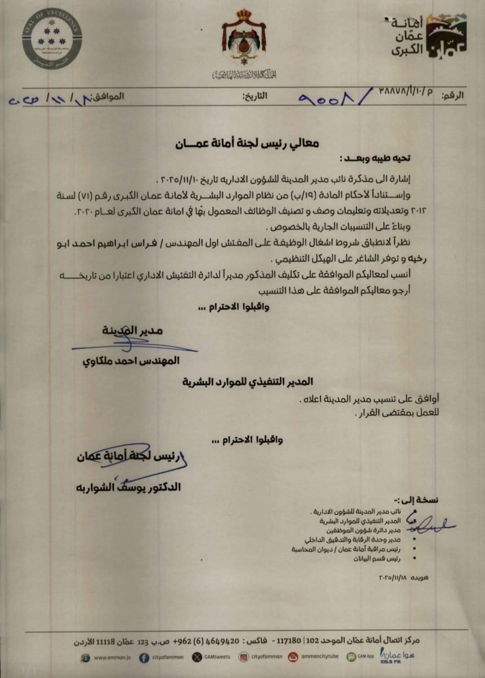 قرر رئيس لجنة أمانة عمان الكبرى الدكتور يوسف الشواربة الموافقة على تنسيب مدير المدينة المهندس أحمد ملكاوي، على نقل مسؤولين وتكليف آخرين بأعمال محددة.