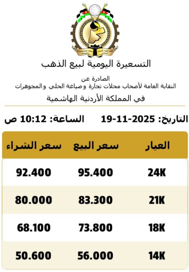 وبحسب النشرة الصباحية الصادرة عن النقابة العامة لأصحاب محلات تجارة وصياغة الحلي والمجوهرات، بلغ سعر غرام الذهب عيار 24 لغايات البيع 95.4 دينار، فيما سجل غرام عيار 18 سعر 73.8 دينار، في حين بلغ سعر غرام عيار 14 نحو 56 دينارا لدى محلات الصاغة.