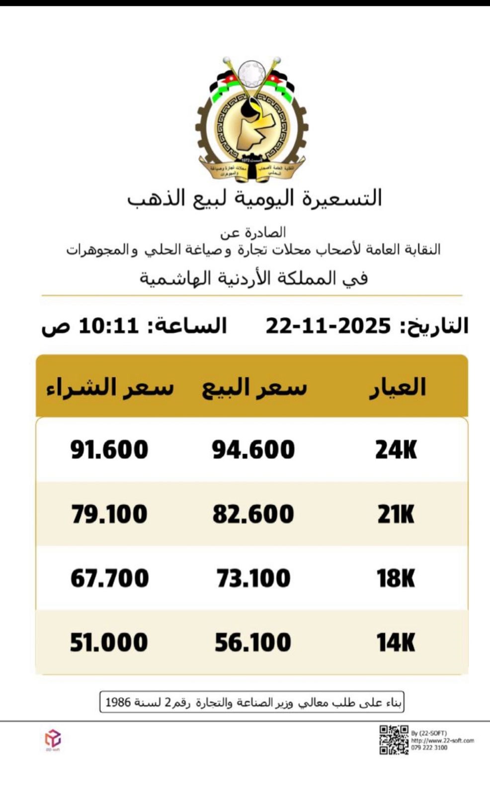 وأظهرت الأسعار المعلنة أن غرام الذهب من عيار 21 الأكثر تداولا في الاردن ارتفع ليصل إلى 82.60 دينار لغايات البيع، مقابل 79.10 دينار لغايات الشراء.