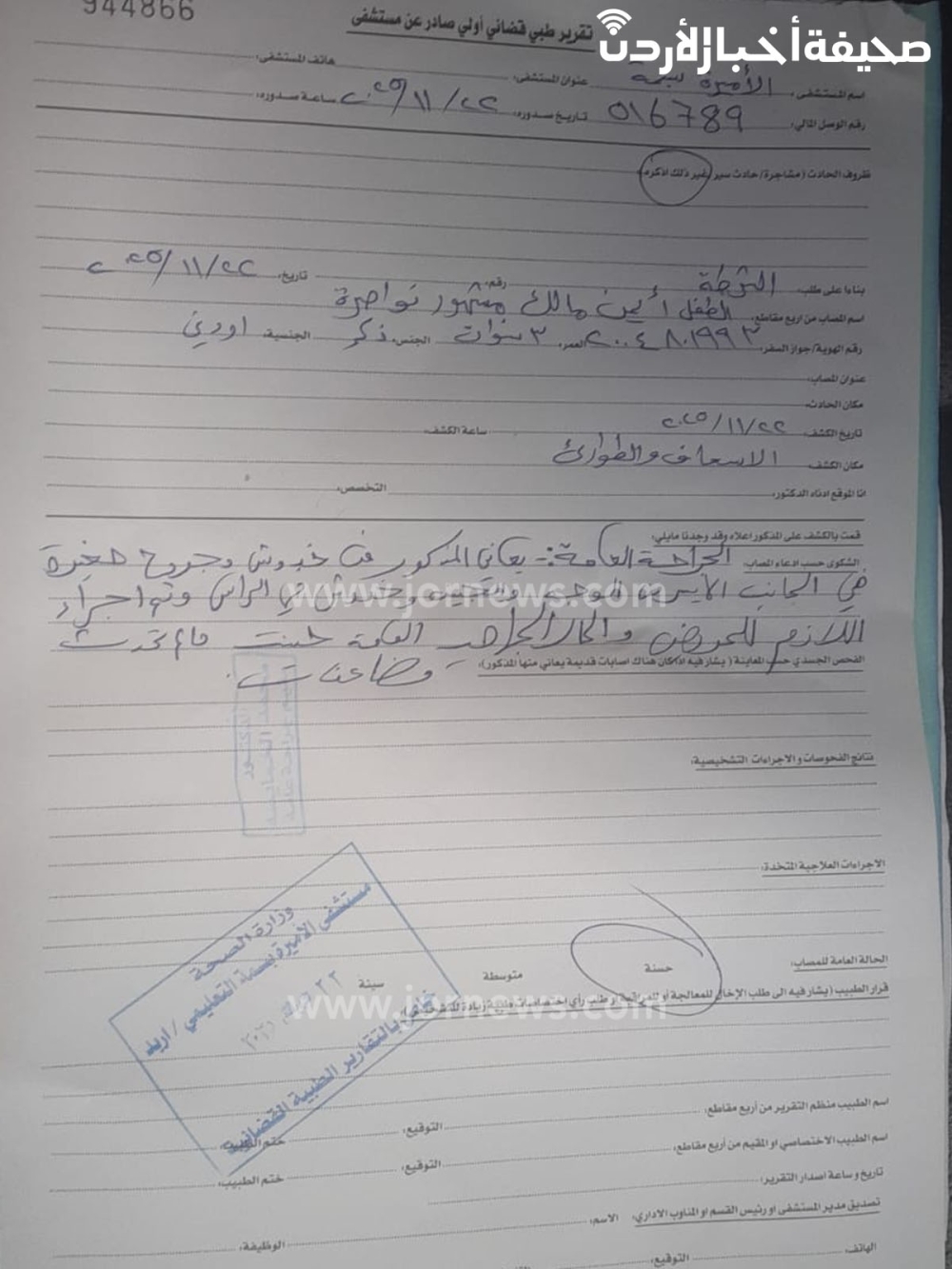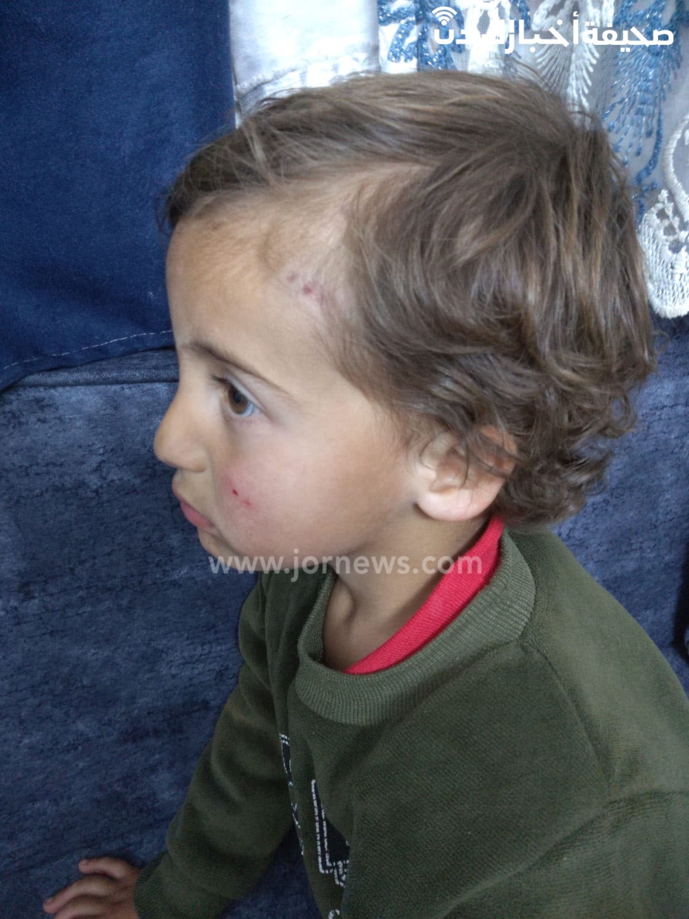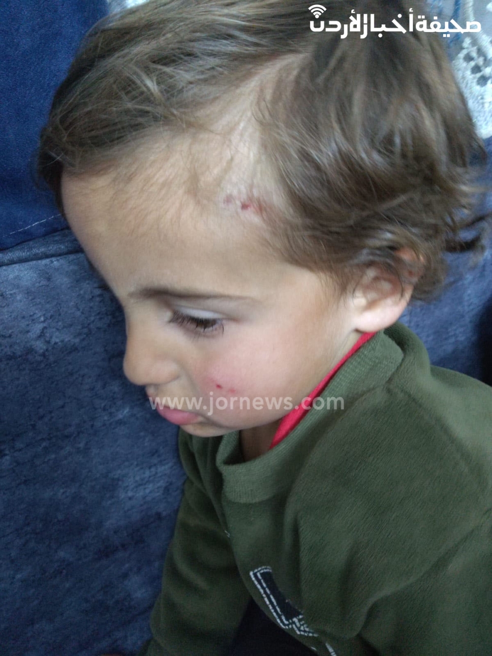 وأوضح نواصرة لصحيفة أخبار الأردن الإلكترونية أن العقر أصاب وجه وجبين طفله أيمن، حيث جرى إسعافه إلى مستشفى الأميرة بسمة لتلقي العلاج.
