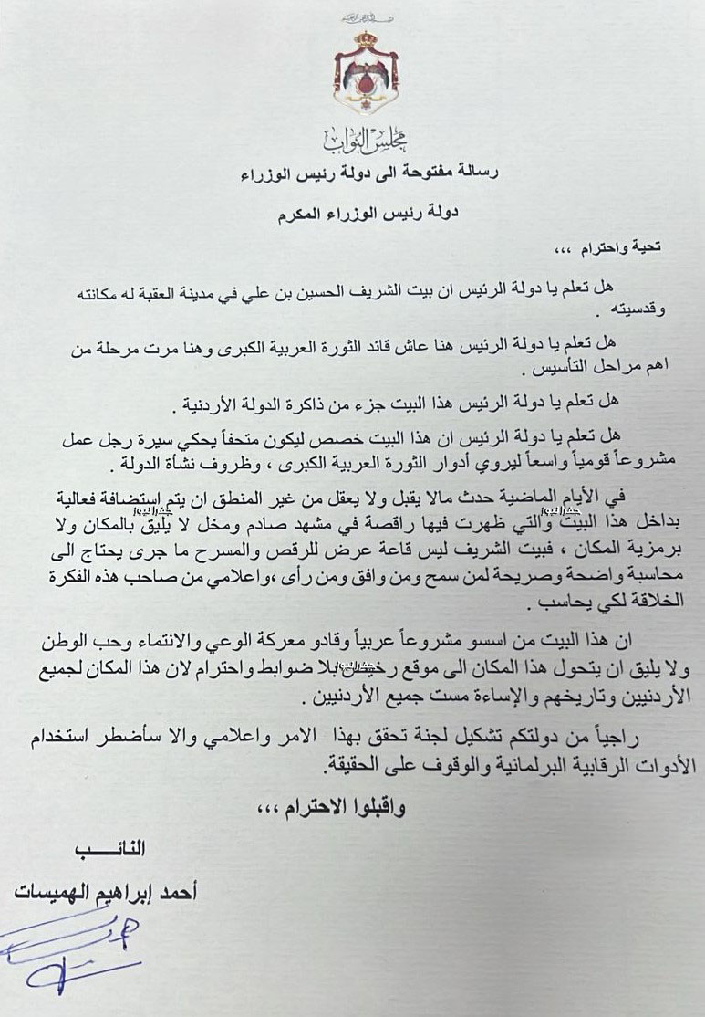 وجه النائب أحمد إبراهيم الهميسات رسالة مفتوحة إلى دولة رئيس الوزراء، طالب فيها بالتحقيق في إقامة فعالية ترفيهية داخل بيت الشريف الحسين بن علي في مدينة العقبة، معتبرًا أن ما جرى "غير مقبول ويخالف المنطق"، بعد ظهور راقصة في مشهد وصفه بـ"الصادم والمخل" خلال الحفل.
