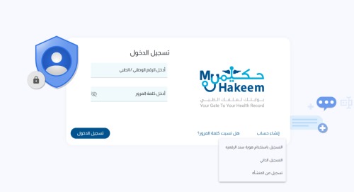 يجب على المستفيد الدخول إلى الصفحة الرئيسية للمنصة (MyHakeem) واختيار "سجل الدخول إلى حكيم" أو "إنشاء حساب" لبدء عملية التسجيل.
