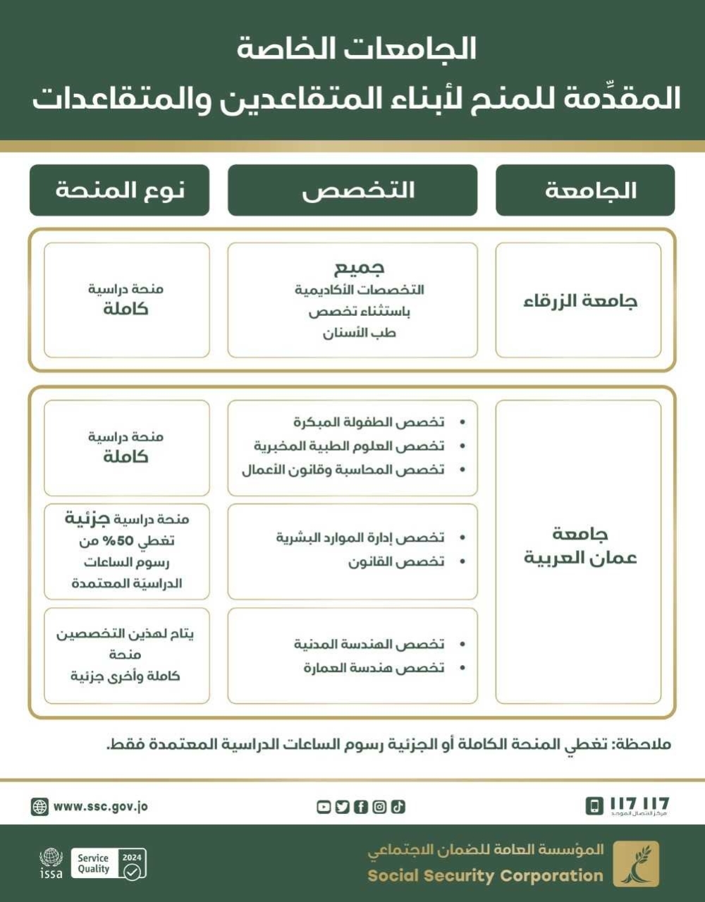 أعلنت المؤسسة العامة للضمان الاجتماعي عن إطلاق برنامج المنح الجامعية لأبناء المتقاعدين الأردنيين للعام الدراسي 2025/2026، بالتعاون مع جامعتي الزرقاء وعمّان العربية، بهدف تمكين الطلاب من متابعة دراستهم الجامعية في مرحلة البكالوريوس.