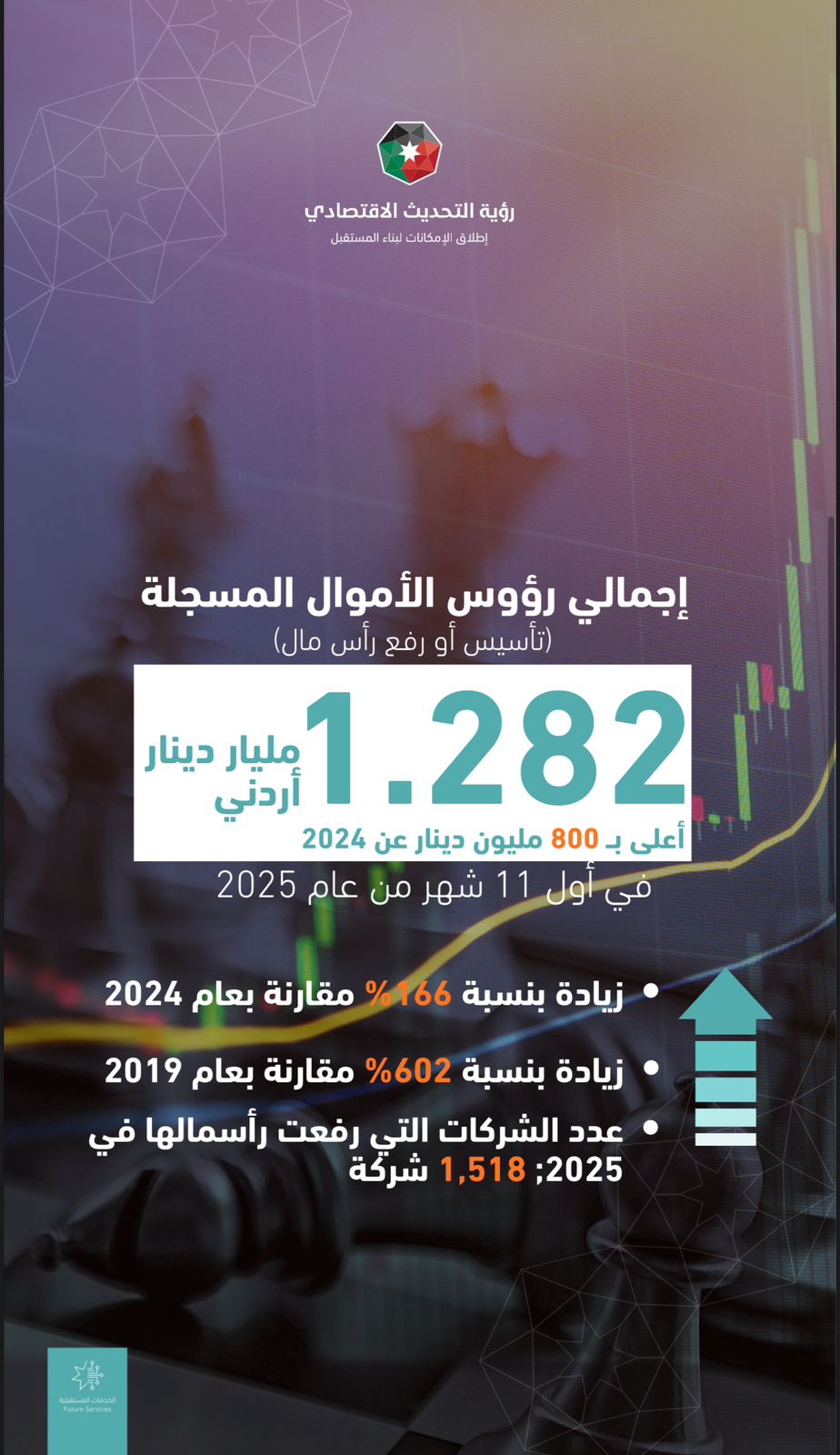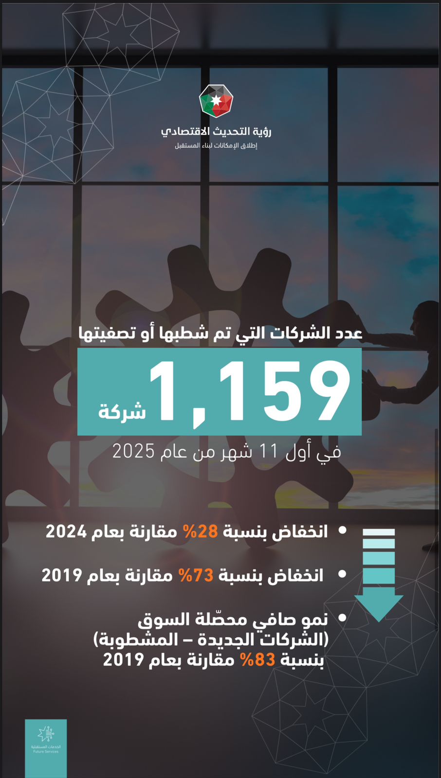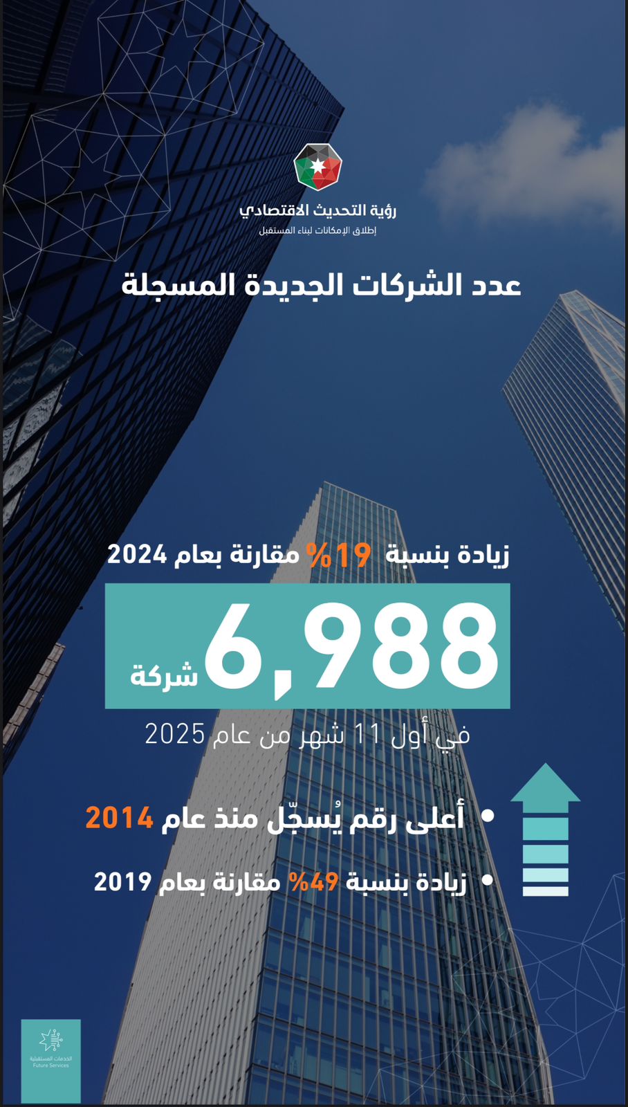 وبحسب الإحصائيات، بلغ عدد الشركات الجديدة المسجلة في الأردن خلال أول 11 شهر من عام 2025 نحو 6,988 شركة، وهو أعلى رقم يتم تسجيله منذ عام 2014، ما يعكس تحسنًا ملحوظًا في بيئة الأعمال وجاذبية السوق الأردني للاستثمار المحلي والأجنبي.