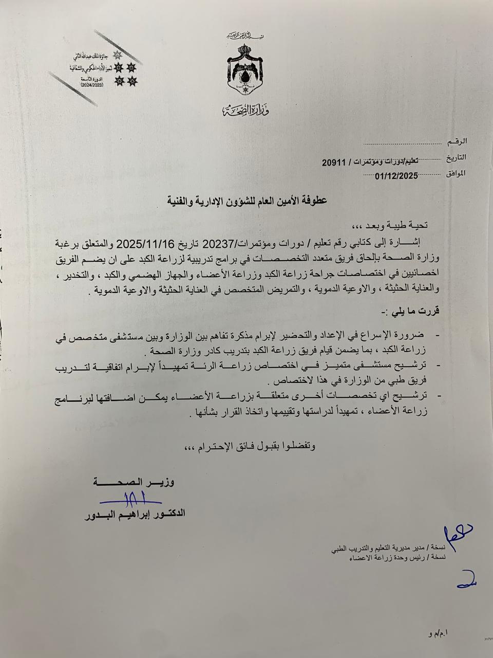 وبحسب الوثيقة الرسمية الصادرة بتاريخ 1 كانون الأول 2025، والموقعة من وزير الصحة الدكتور إبراهيم البدور، فقد تقرر الإسراع في إعداد مذكرة تفاهم مع مستشفى متخصص في زراعة الكبد، لضمان تدريب الفرق الطبية التابعة للوزارة في مجالات الجراحة، الجهاز الهضمي، التخدير، العناية الحثيثة، الأوعية الدموية، والتمريض المتخصص.