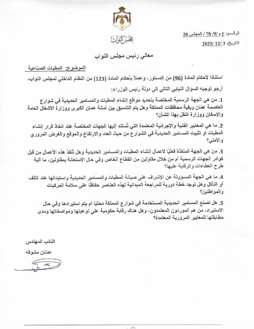 وجّه النائب عدنان مشوقة سؤالًا نيابيًا إلى دولة رئيس الوزراء حول الفوضى الناجمة عن المطبات الصناعية والمسامير الحديدية المنتشرة في شوارع المملكة، طالب فيه بتوضيح آليات تنظيم هذه العملية والجهات المسؤولة عنها.