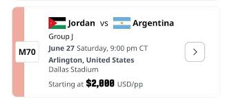 وجاءت اقل سعر تذكرة لمباريات النشامى هي 1450 الف دولار وهي لمباريات النمسا والجزائر واقل سعر للأرجنتين 2000 دولار وأغلى تذكرة تصل الى 12 الف دولار