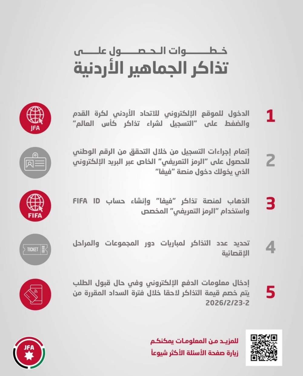 أعلن الاتحاد الأردني لكرة القدم عن الإجراءات الخاصة بالحصول على تذاكر مباريات منتخب النشامى في كأس العالم 2026، موضحًا أن عملية الشراء تتم عبر منصتين رسميتين.