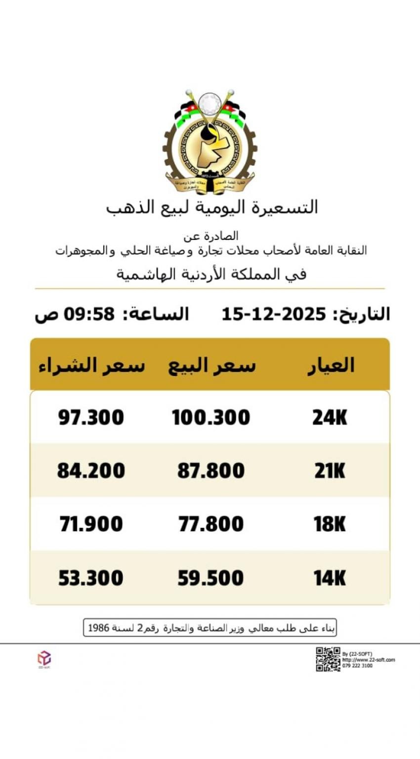 كما بلغ سعر الغرام الواحد من الذهب عيارات 24 و18 و14 لغايات البيع من محالّ الصاغة 100.30 و77.80 و59.50 دينارا على التوالي.