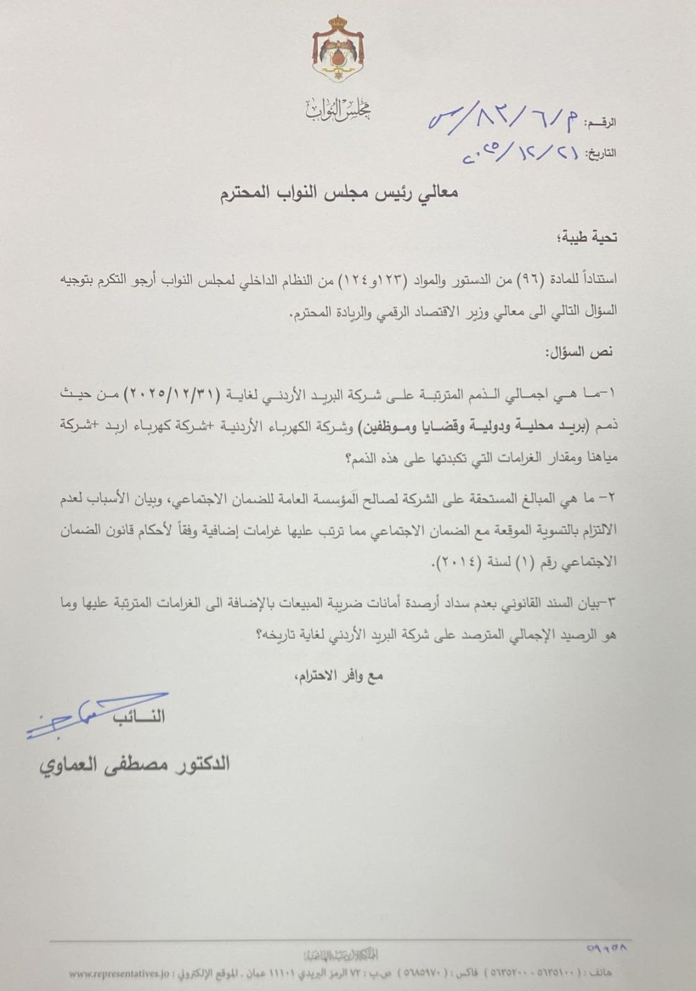 كما سأل عن المبالغ المستحقة للمؤسسة العامة للضمان الاجتماعي على شركة البريد الأردني، وأسباب عدم الالتزام بالتسوية الموقعة معها، والغرامات الإضافية المترتبة وفقًا لأحكام قانون الضمان الاجتماعي رقم (1) لسنة 2014.