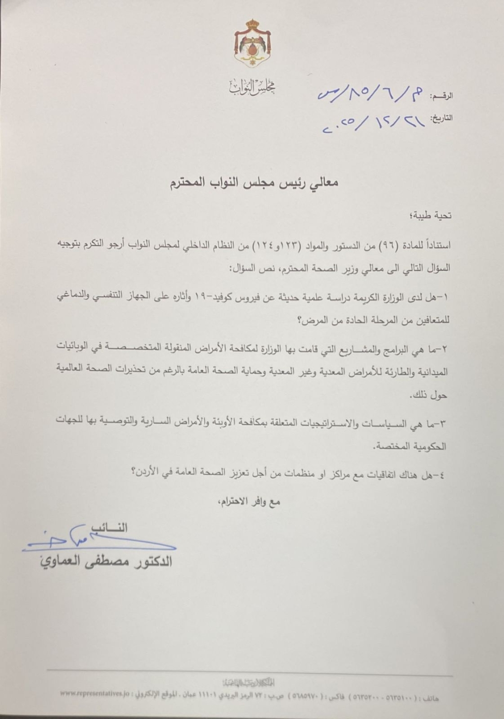 وطالب العماوي بتوضيح السياسات والاستراتيجيات الوطنية المتعلقة بمكافحة الأوبئة والأمراض السارية، ومدى التنسيق والتوصيات المقدّمة للجهات الحكومية المختصة، إضافة إلى الاستفسار عن وجود اتفاقيات مع مراكز أو منظمات دولية تهدف إلى تعزيز الصحة العامة في الأردن.