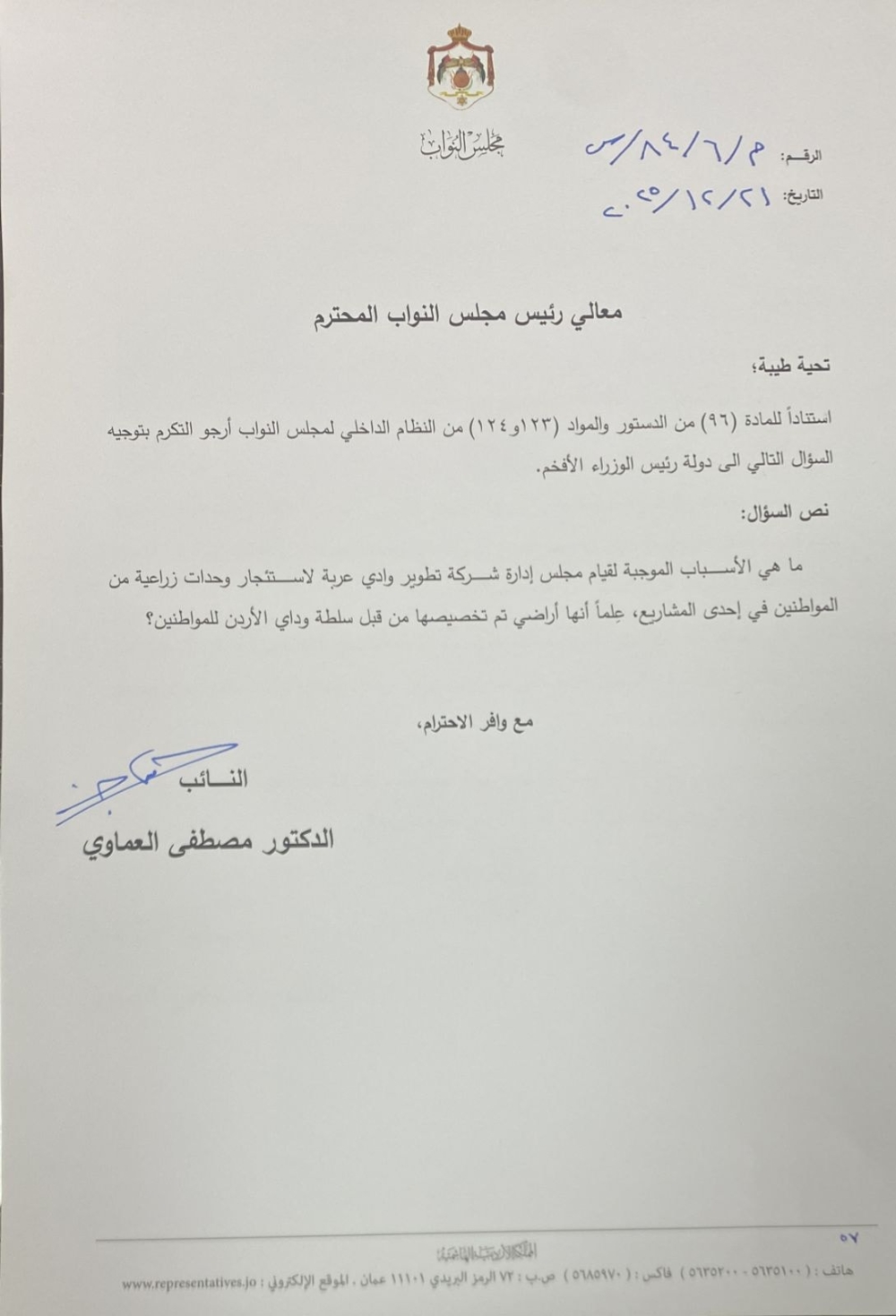 وفي ملف الأراضي والزراعة، وجّه العماوي سؤالًا إلى رئيس الوزراء حول الأسباب الموجبة لقيام مجلس إدارة شركة تطوير وادي عربة باستئجار وحدات زراعية من مواطنين، رغم أن هذه الأراضي مخصصة أساسًا لهم من قبل سلطة وادي الأردن ضمن مشاريع رسمية، متسائلًا عن الأسس القانونية والإدارية التي استند إليها هذا القرار.