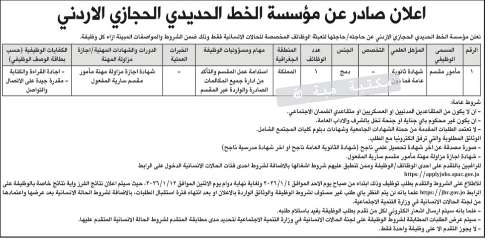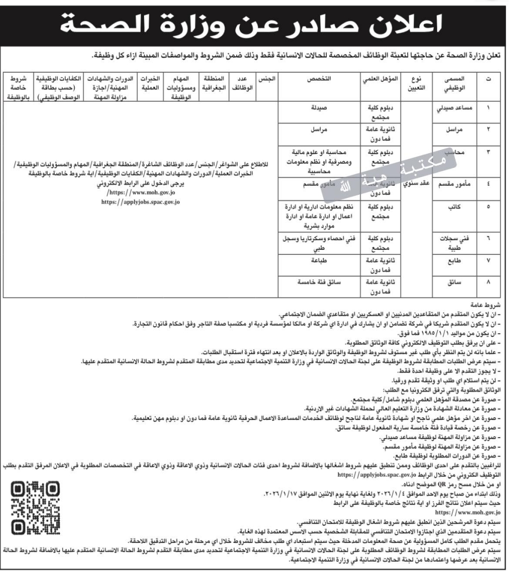 وبيّنت الجهات المعنية أن نشر رابط التقديم الإلكتروني سيبدأ اعتباراً من يوم الأحد الموافق 4/1/2026، على أن يتم الإعلان عن تفاصيل الوظائف، وشروط التقديم، وآلية الاختيار عبر الرابط المخصص لذلك.