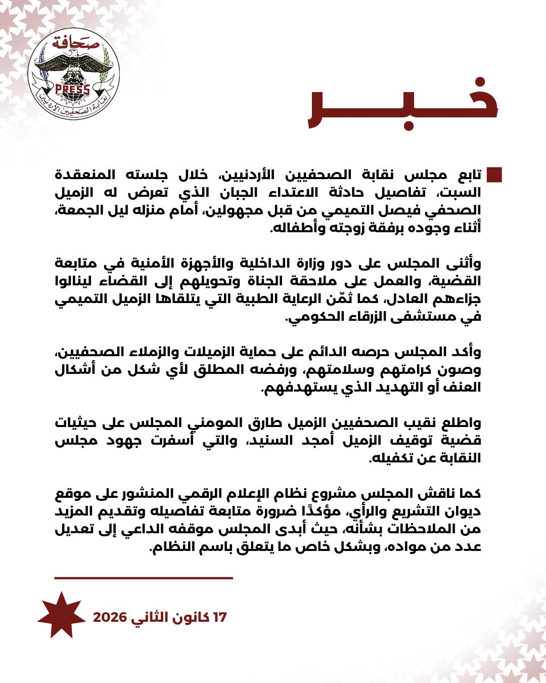 وأثنى المجلس على دور وزارة الداخلية والأجهزة الأمنية في متابعة القضية، والعمل على ملاحقة الجناة وتحويلهم إلى القضاء لينالوا جزاءهم العادل، كما ثمّن الرعاية الطبية التي يتلقاها الزميل التميمي في مستشفى الزرقاء الحكومي.