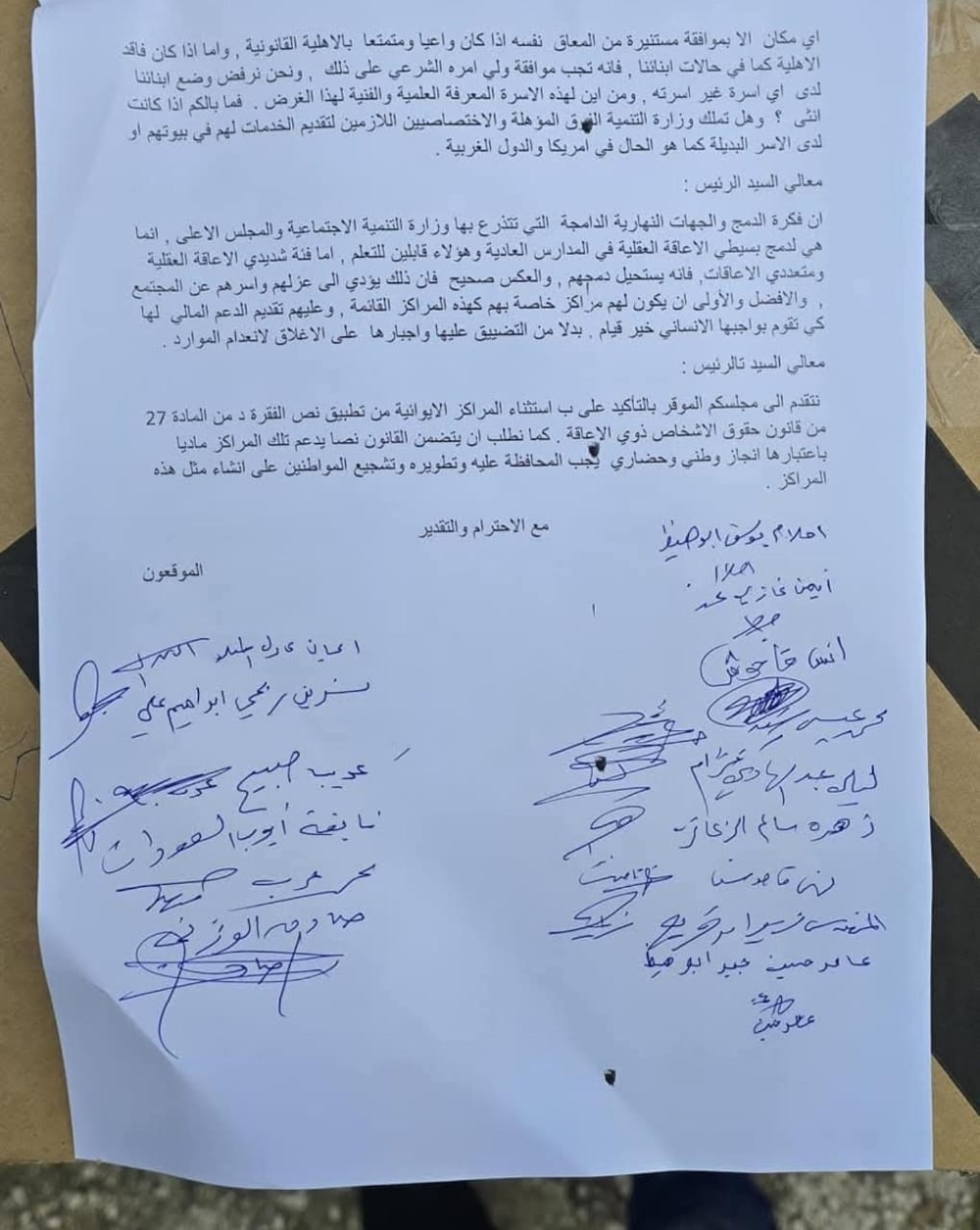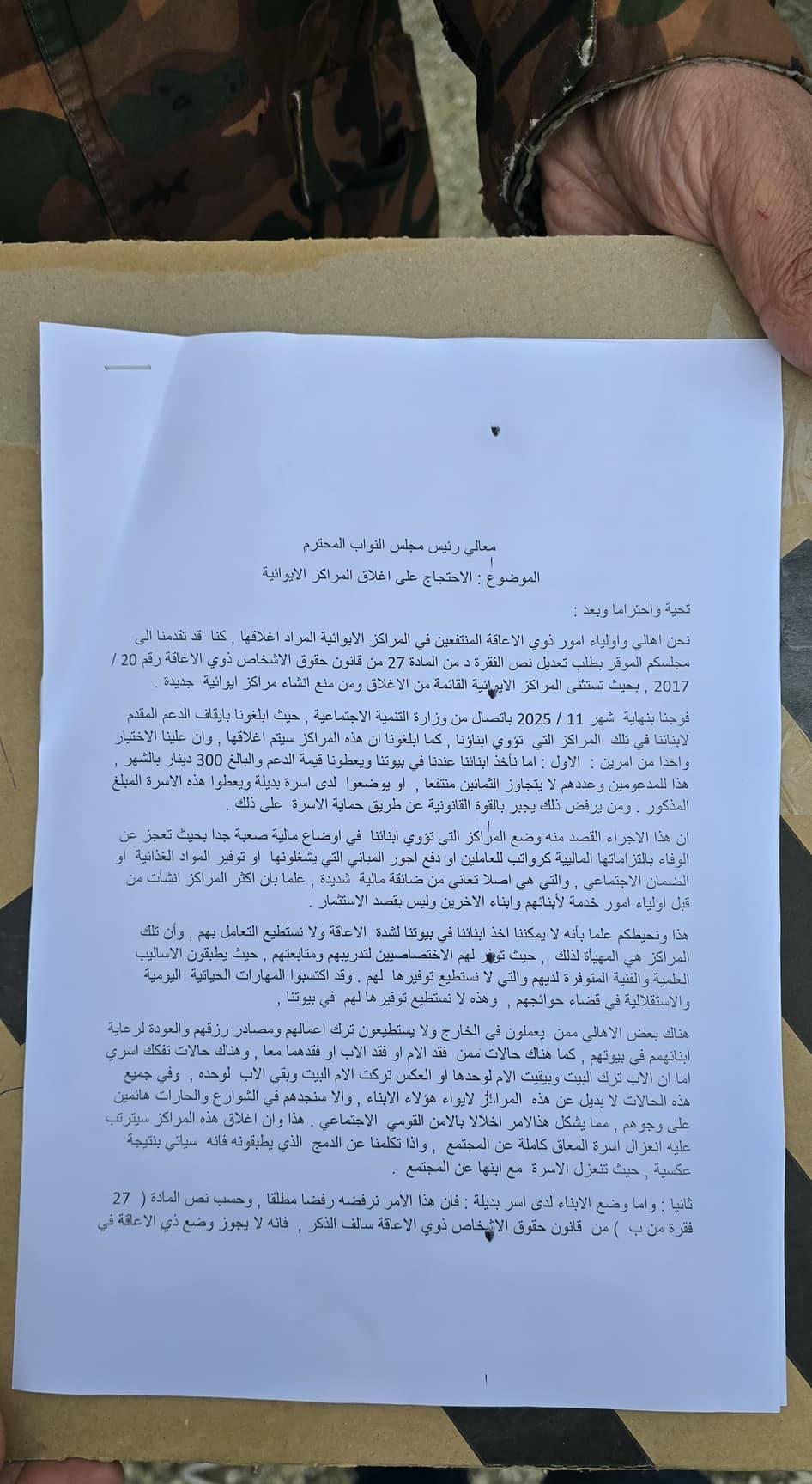 وأكد مقدمو المذكرة أن المراكز الإيوائية تشكّل الملاذ الوحيد لأبنائهم، خصوصًا من ذوي الإعاقات الشديدة والمتعددة، في ظل أوضاع اقتصادية صعبة تعاني منها الأسر، وعدم قدرتها على توفير الرعاية المتخصصة داخل المنازل. وأشاروا إلى أن إيقاف الدعم المالي عن هذه المراكز سيؤدي إلى عجزها عن الاستمرار وتقديم خدماتها الأساسية.