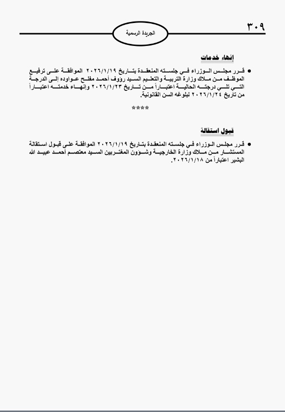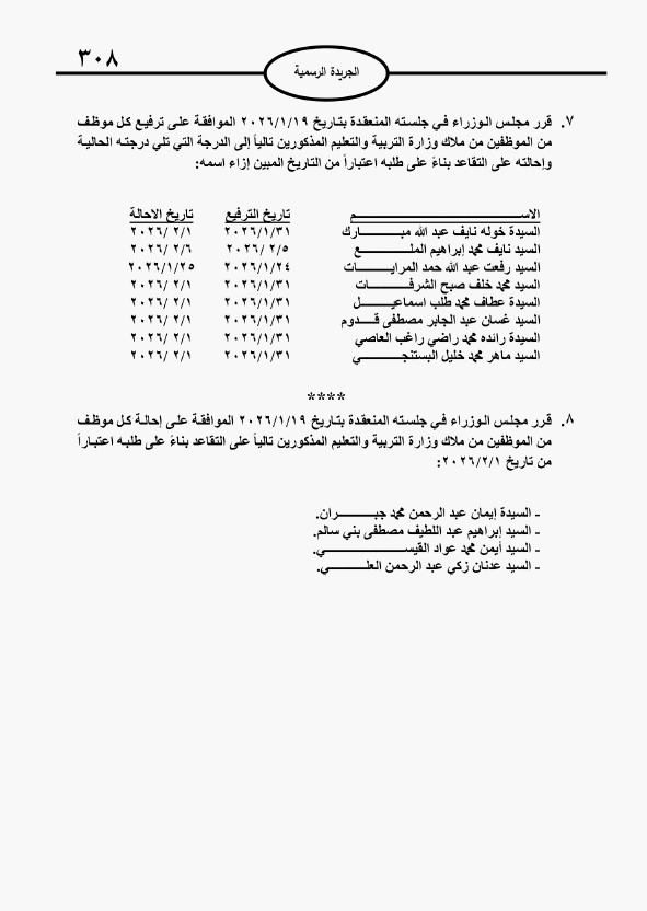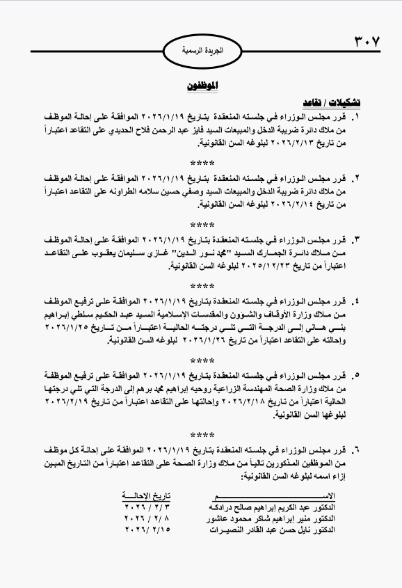 كما تقرر ترفيع وإحالة عدد من الموظفين في عدد من الوزارات والدوائر إلى التقاعد.
