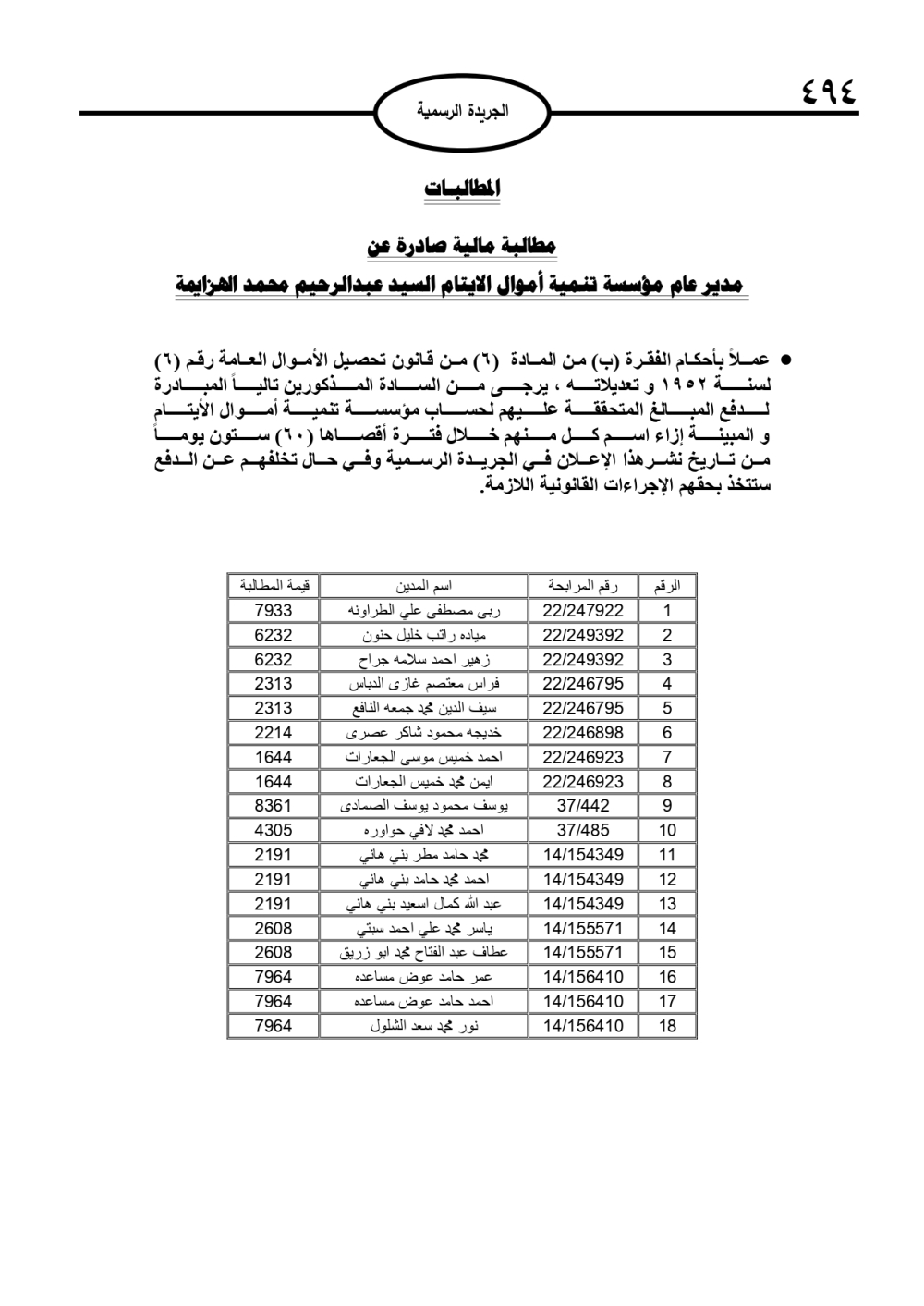 صدرت مطالبات مالية على عشرات الأردنيين لصالح مؤسسة تنمية أموال الأيتام وبلدية سحاب.
