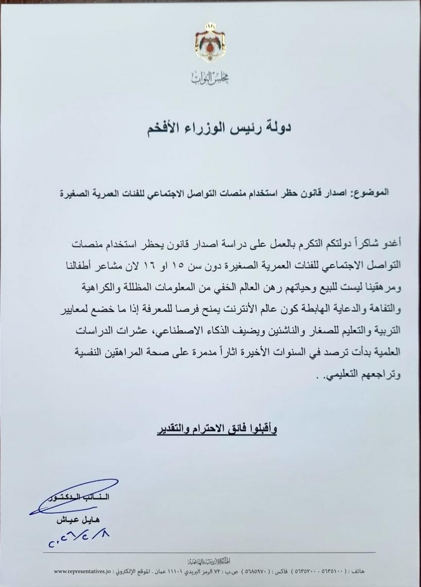 وجّه النائب الدكتور هائل عياش كتابًا رسميًا إلى رئيس الوزراء، دعا فيه إلى إصدار قانون يحظر استخدام منصات التواصل الاجتماعي للفئات العمرية الصغيرة دون سن 15 أو 16 عامًا، حفاظًا على صحة الأطفال النفسية وحمايتهم من مخاطر العالم الرقمي.