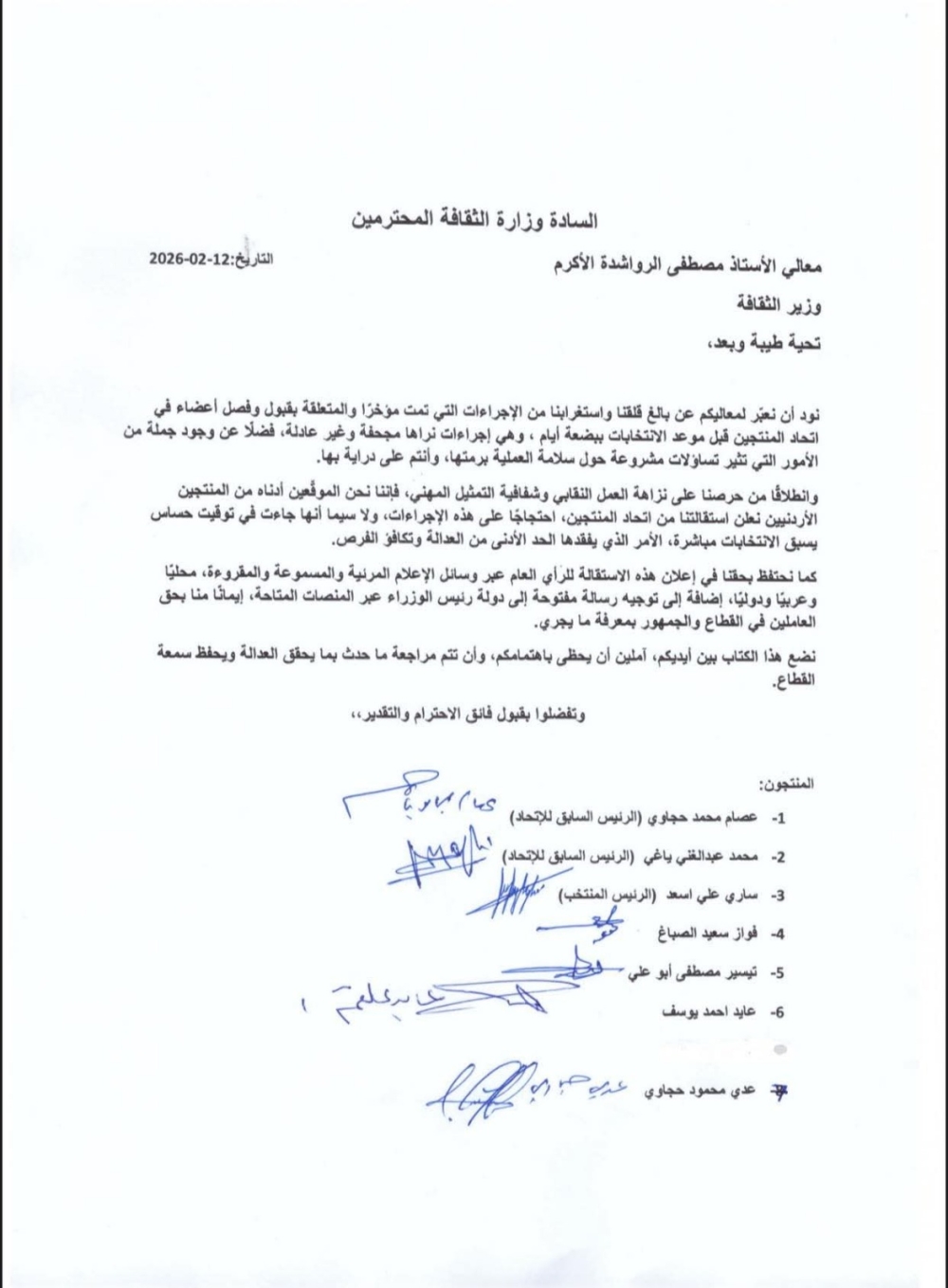 وجاء في كتاب رسمي موجه إلى وزارة الثقافة وقّعه مجموعة من المنتجين، من بينهم الرؤساء السابقون للرابطة عصام محمد حجاوي ومحمد عبد الغني ياغي، إضافة إلى الرئيس المنتخب ساري علي أسعد، وفواز سعيد الصباغ، وتيسير مصطفى أبو علي، وعايد أحمد يوسف، أن الإجراءات الأخيرة المتعلقة بقبول وفصل أعضاء قبل الانتخابات أثارت استغرابهم وقلقهم، معتبرين أن توقيتها يقوض العدالة ويضعف تكافؤ الفرص أمام المرشحين.
