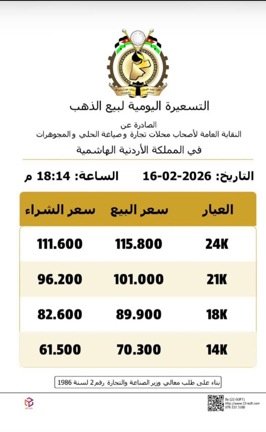 عيار 21 (الأكثر طلبًا بين المواطنين): 101.00 دينار للبيع، و96.200 دينار للشراء.