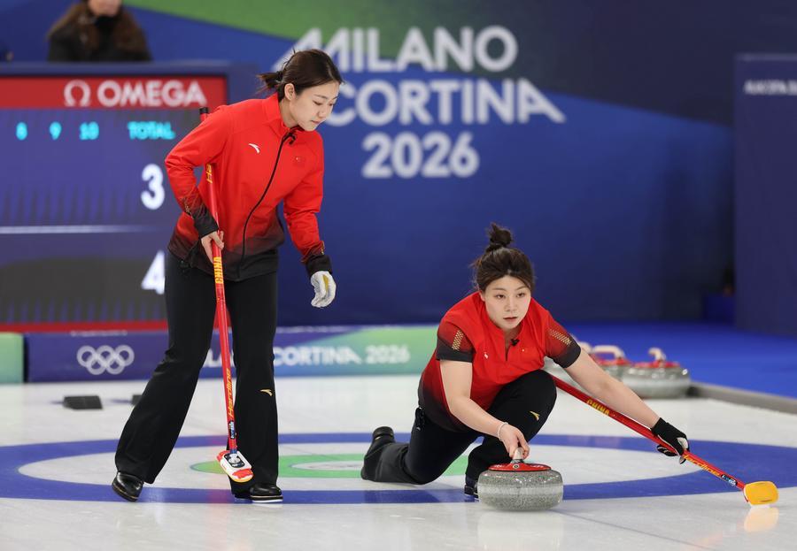 كورتينا دامبيتسو 19 فبراير 2026 (شينخوا) لاعبات الصين تتنافسن خلال مباراة الجولة الـ11 من مرحلة الدوري لمسابقة الكيرلنغ للسيدات بين الصين والسويد ضمن فعاليات دورة الألعاب الأولمبية الشتوية ميلانو-كورتينا 2026، في إيطاليا، يوم 18 فبراير 2026.■