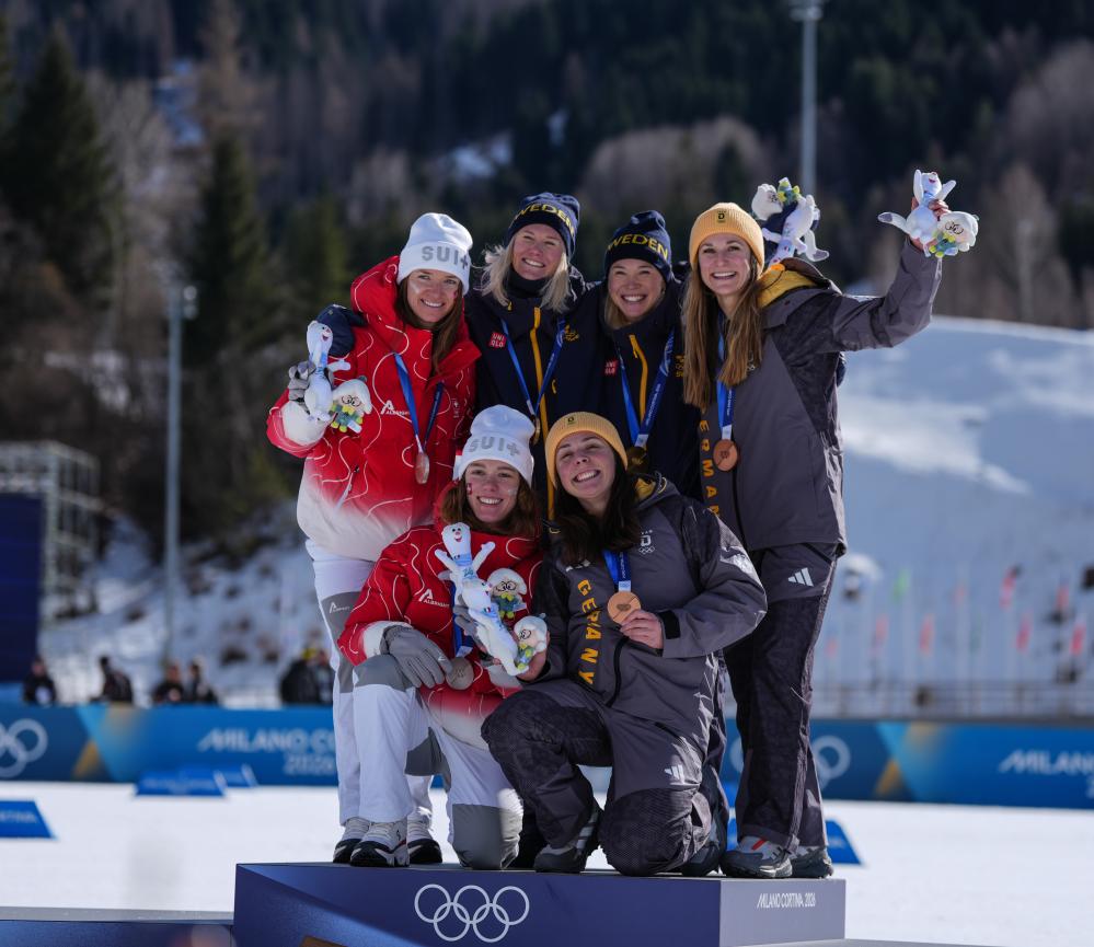 حصلت السويديتان جونا ساندلينج وماجا دالكفيست على ذهبية التزلج الريفي للفرق (سبرينت حرة) للسيدات، بينما حصلت السويسريتان ناديا كايلين ونادين فاهندريش على الفضية والألمانيتان لورا جيملر وكوليتا ريدزيك على البرونزية، وذلك في منافسات دورة الألعاب الأولمبية الشتوية ميلانو-كورتينا 2026، في تيسيرو، إيطاليا.■