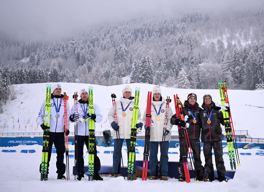 في الصورة الملتقطة يوم 19 فبراير 2026، الحائزان على الميدالية الذهبية ينس لوراس أوفتيبرو وأندرياس سكوجلوند، من النرويج، والحائزان على الميدالية الفضية إيلكا هيرولا وإيرو هيرفونن من فنلندا، والحائزان على الميدالية البرونزية ستيفان ريتينيغر ويوهانيس لامبارتر من النمسا، يقفون لالتقاط صور لهم خلال مراسم التتويج عقب سباق التزلج النوردي المزدوج، ضمن دورة الألعاب الأولمبية الشتوية ميلانو-كورتينا 2026، في مدينة تيزيرو الإيطالية. (شينخوا)في الصورة الملتقطة يوم 19 فبراير 2026، اللاعبان الفنلنديان الحائزان على الميدالية الفضية إيلكا هيرولا وإيرو هيرفونن، يقفان لالتقاط صور لهما خلال مراسم التتويج عقب سباق التزلج النوردي المزدوج، ضمن دورة الألعاب الأولمبية الشتوية ميلانو-كورتينا 2026، في مدينة تيزيرو الإيطالية. (شينخوا)في الصورة الملتقطة يوم 19 فبراير 2026، لاعبون يتنافسون خلال سباق التزلج الريفي ضمن منافسات التزلج النوردي المزدوج، في دورة الألعاب الأولمبية الشتوية ميلانو-كورتينا 2026، في مدينة تيزيرو الإيطالية. (شينخوا)في الصورة الملتقطة يوم 19 فبراير 2026، الصيني تشاو تسي خه، خلال مشاركته في سباق التزلج الريفي ضمن منافسات التزلج النوردي المزدوج، في دورة الألعاب الأولمبية الشتوية ميلانو-كورتينا 2026، في مدينة تيسيرو الإيطالية. (شينخوا)