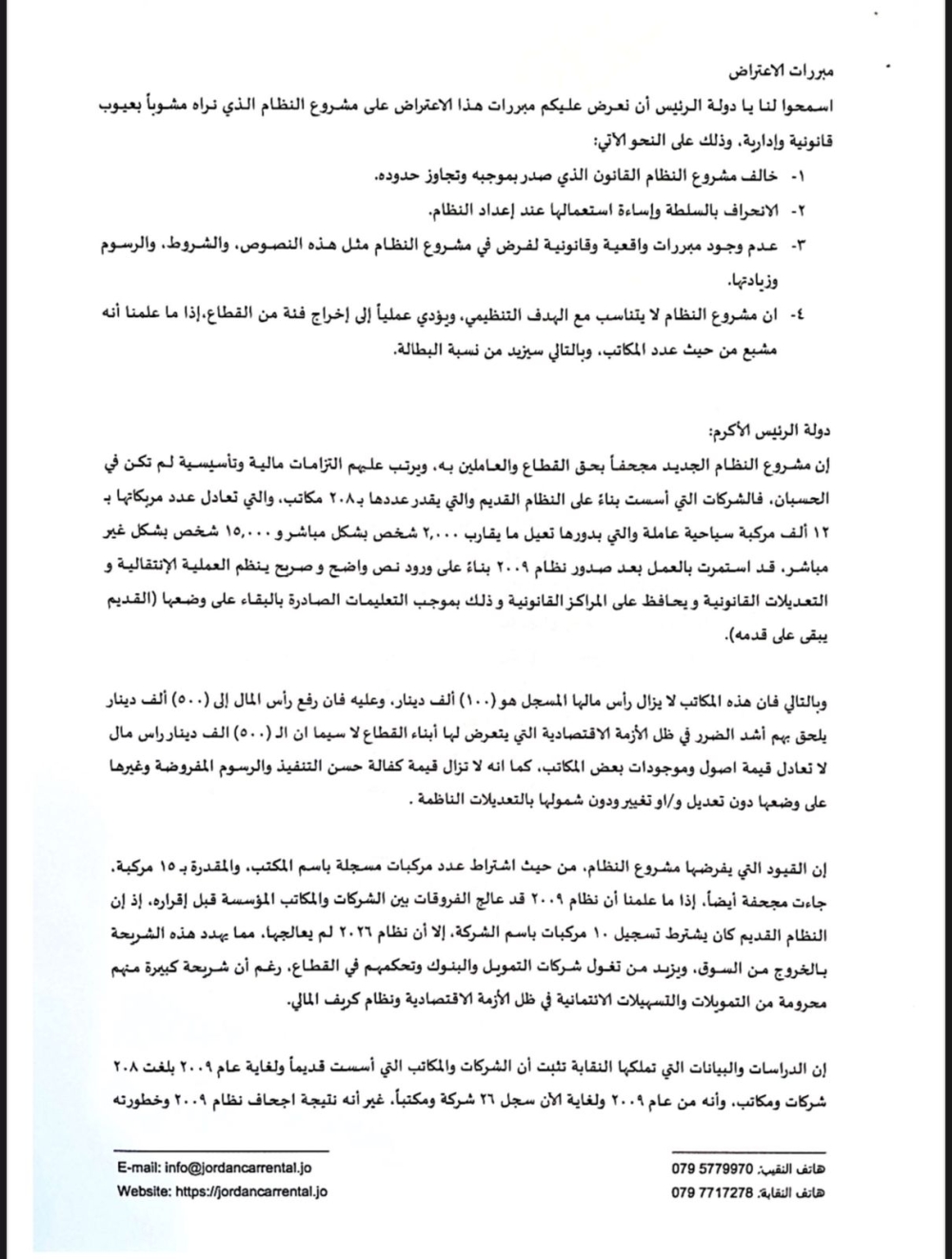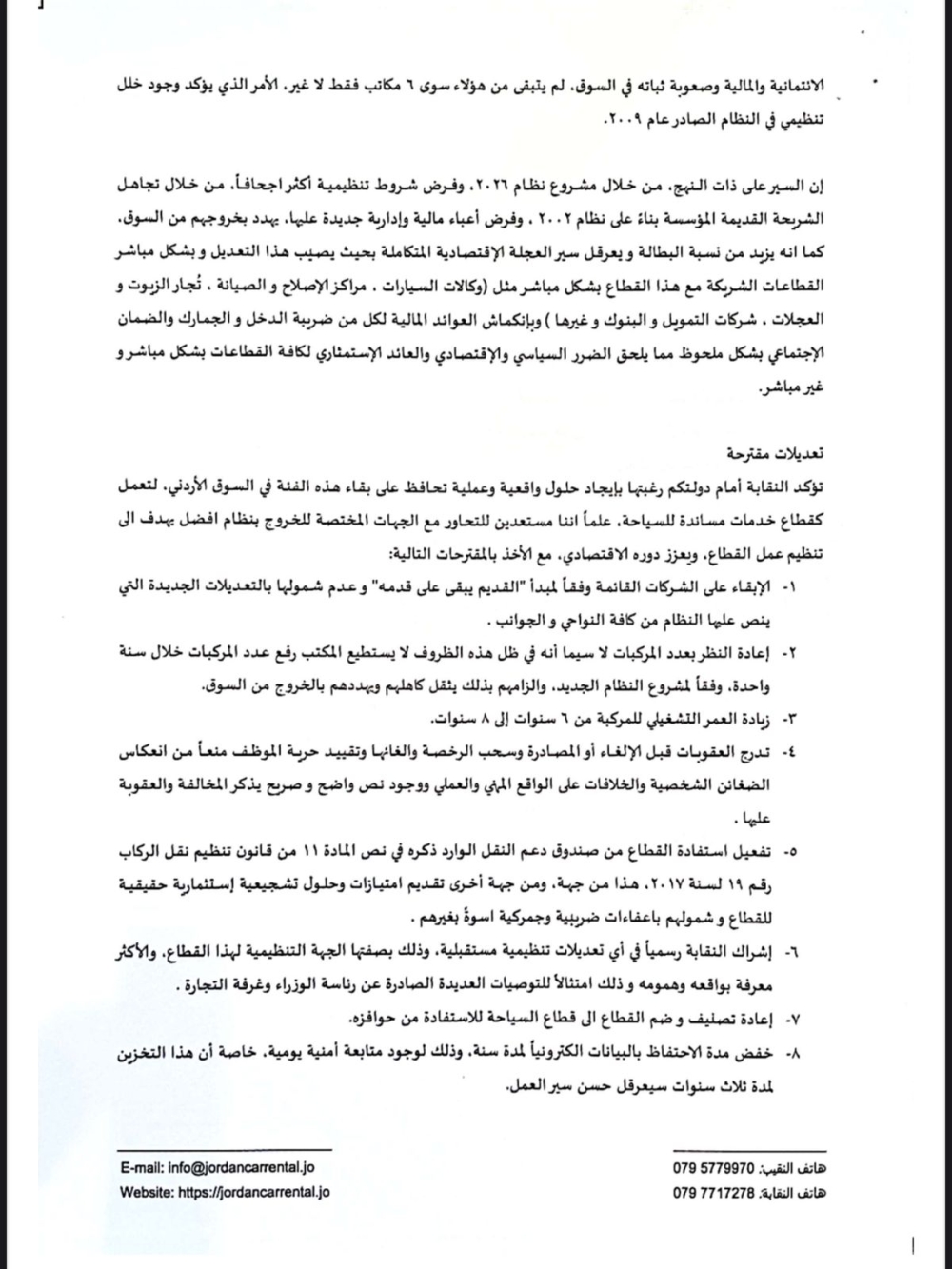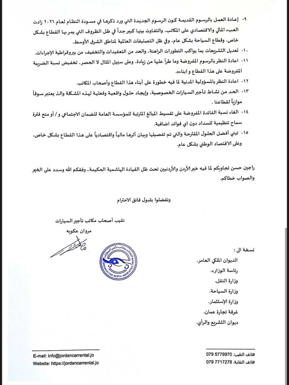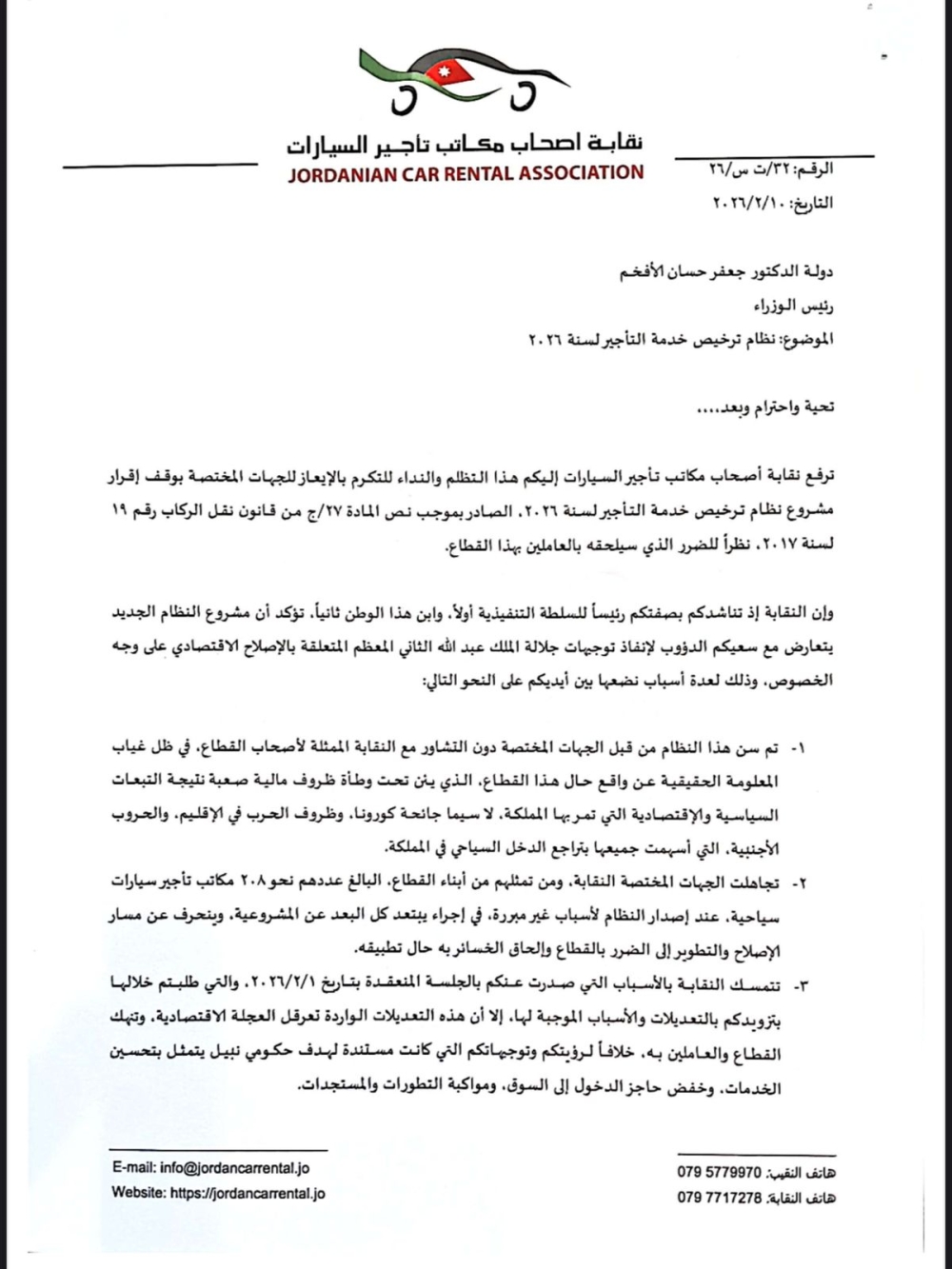 وجهت نقابة اصحاب مكاتب تأجير السيارات كتاب تظلم ونداء إلى رئيس الوزراء الدكتور جعفر حسان، احتجاجا على مسودة نظام ترخيص خدمة التأجير لسنة ٢٠٢٦.