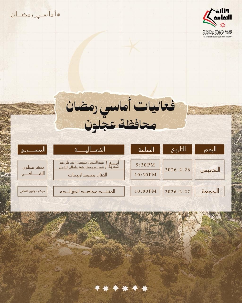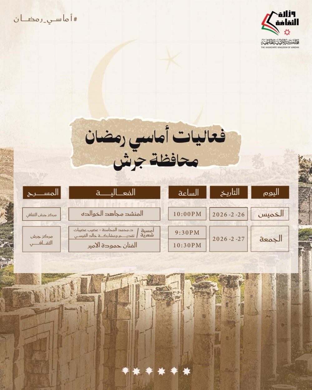 وأضاف أن البرنامج يشتمل كذلك على فقرات ترفيهية مخصصة للأطفال ومناسبة للعائلة الأردنية، بما يعكس القيم السمحة لرمضان، مؤكدًا أن الحراك الثقافي يشكل جزءًا أصيلًا من المشهد الرمضاني في المملكة.