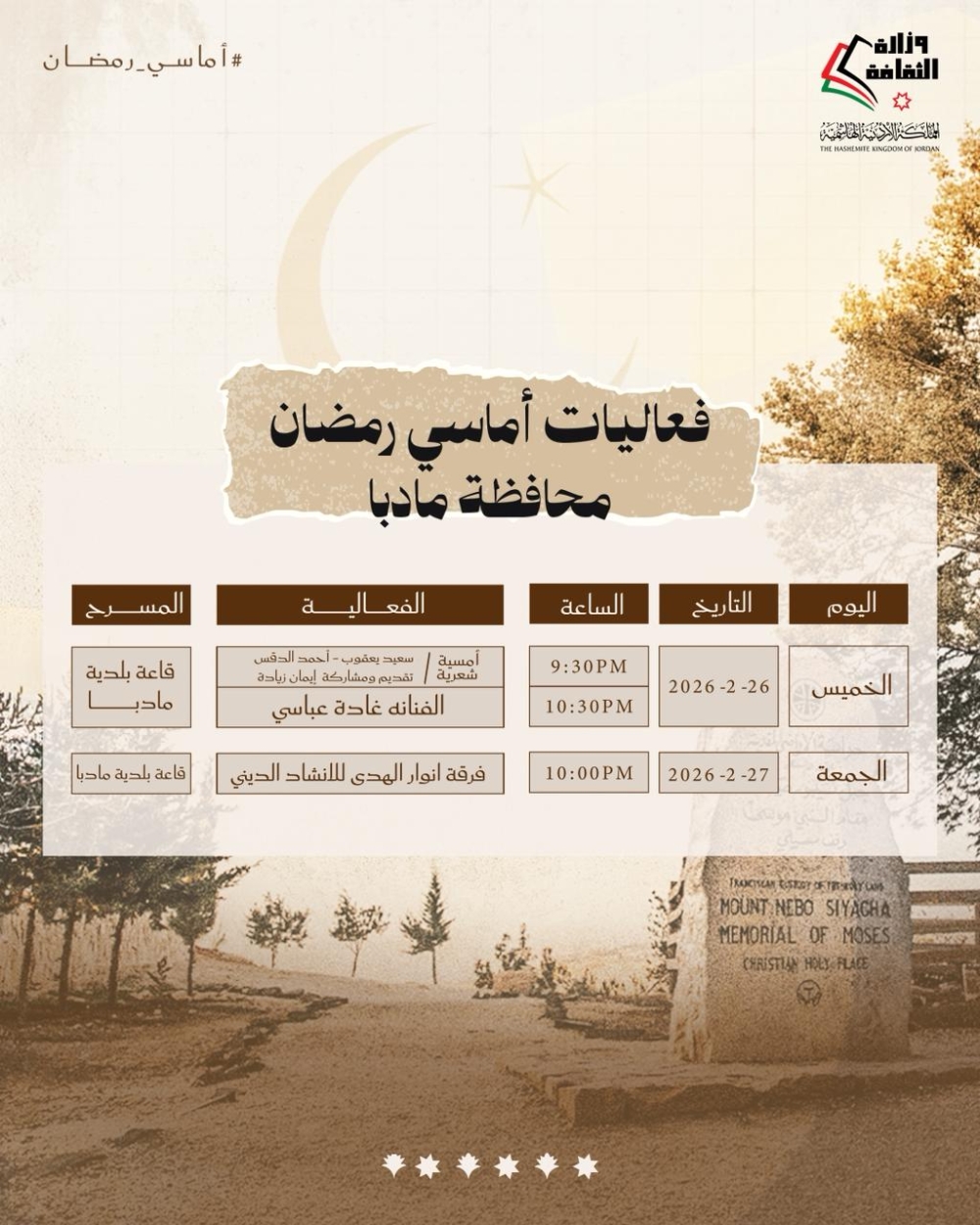 في محافظة مادبا، تحتضن قاعة بلدية مادبا، يوم الخميس، أمسية شعرية بمشاركة الشعراء: سعيد يعقوب، وأحمد الدقس، وتقدمها وتشارك فيها إيمان زيادة. فيما تقدم الفنانة غادة عباسي، أمسية فنية، الساعة العاشرة والنصف مساءً.