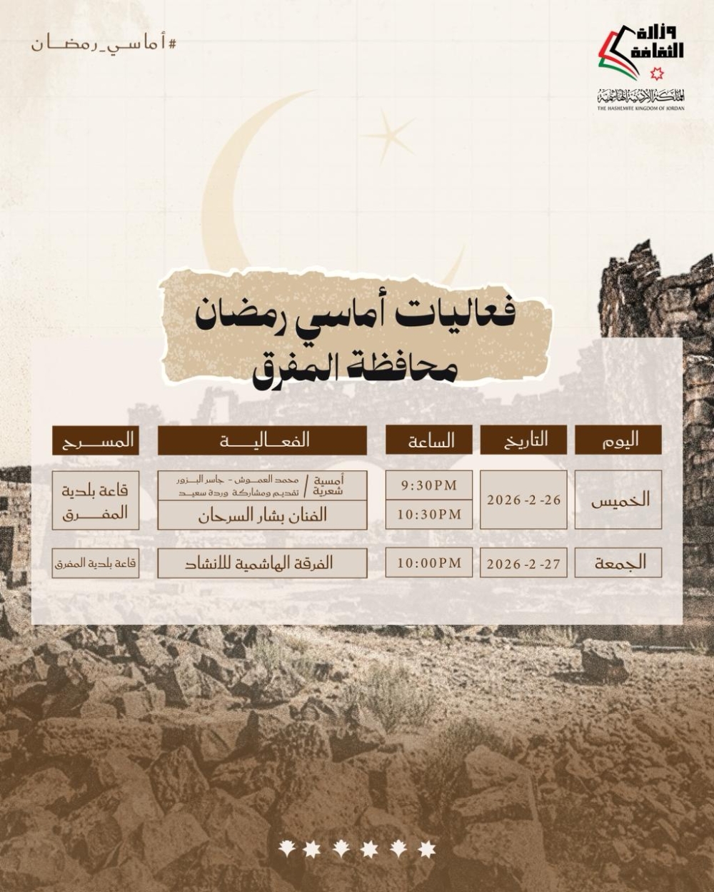 في محافظة المفرق، تقام يوم الخميس، في قاعة بلدية المفرق، الساعة التاسعة والنصف مساءً، أمسية شعرية بمشاركة: محمد العموش، وجاسر البزور، وتقدمها وتشارك فيها وردة سعيد، في حين يقدم الفنان نشار السرحان أمسية فنية، الساعة العاشرة والنصف مساءً.