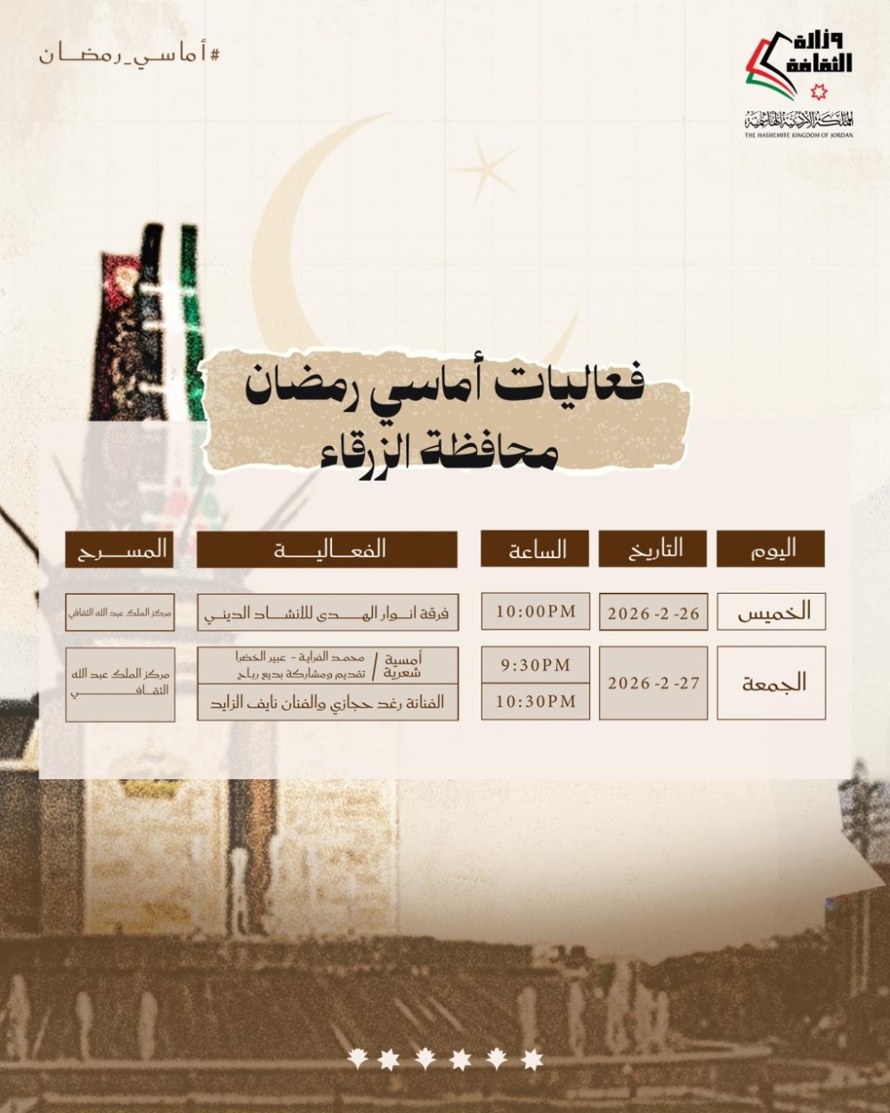 وقال وزير الثقافة مصطفى الرواشدة إن البرنامج يتضمن فعاليات متنوعة تراعي التعدد الثقافي وتعمل على ترسيخ القيم الإيجابية خلال أيام الشهر الفضيل، مشيرًا إلى مشاركة فرق إنشاد ديني ومنشدين أردنيين وعرب.