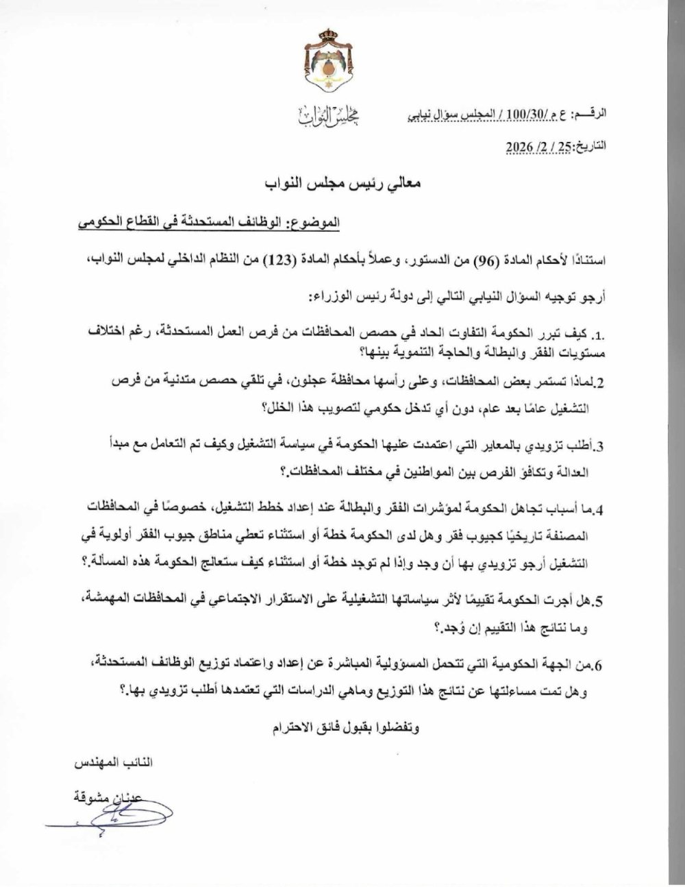 النائب مشوقة يسأل الحكومة عن عدالة الوظائف المستحدثة في القطاع العام.