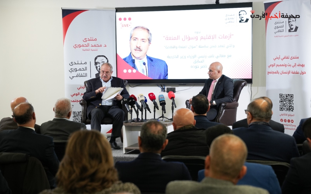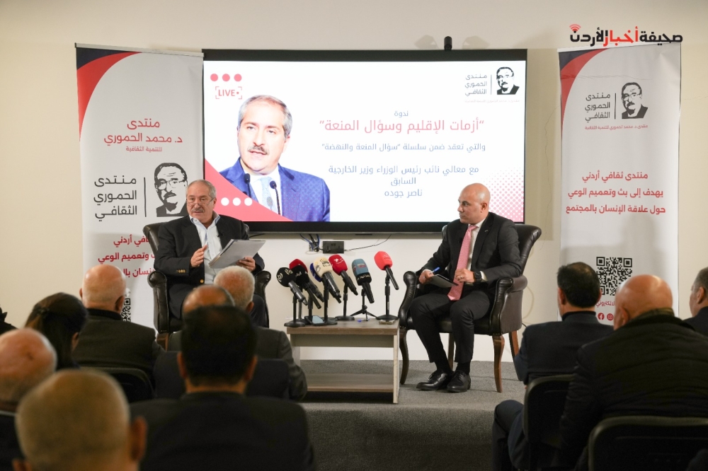 أكد نائب رئيس الوزراء ووزير الخارجية الأسبق، ناصر جودة، أن مصلحة الأردن العليا لا تعلو عليها أي أولوية أخرى، وأن المملكة ستدافع عن سيادتها بكل قوة في وجه أي تداعيات للأزمات المحيطة. جاء ذلك خلال الجلسة الثانية من سلسلة ندوات "سؤال المنعة والنهضة" التي نظمها منتدى الدكتور محمد الحموري للتنمية الثقافية، السبت، تحت عنوان "أزمات الإقليم وسؤال المنعة"، وأدارها الإعلامي محمد الخالدي.