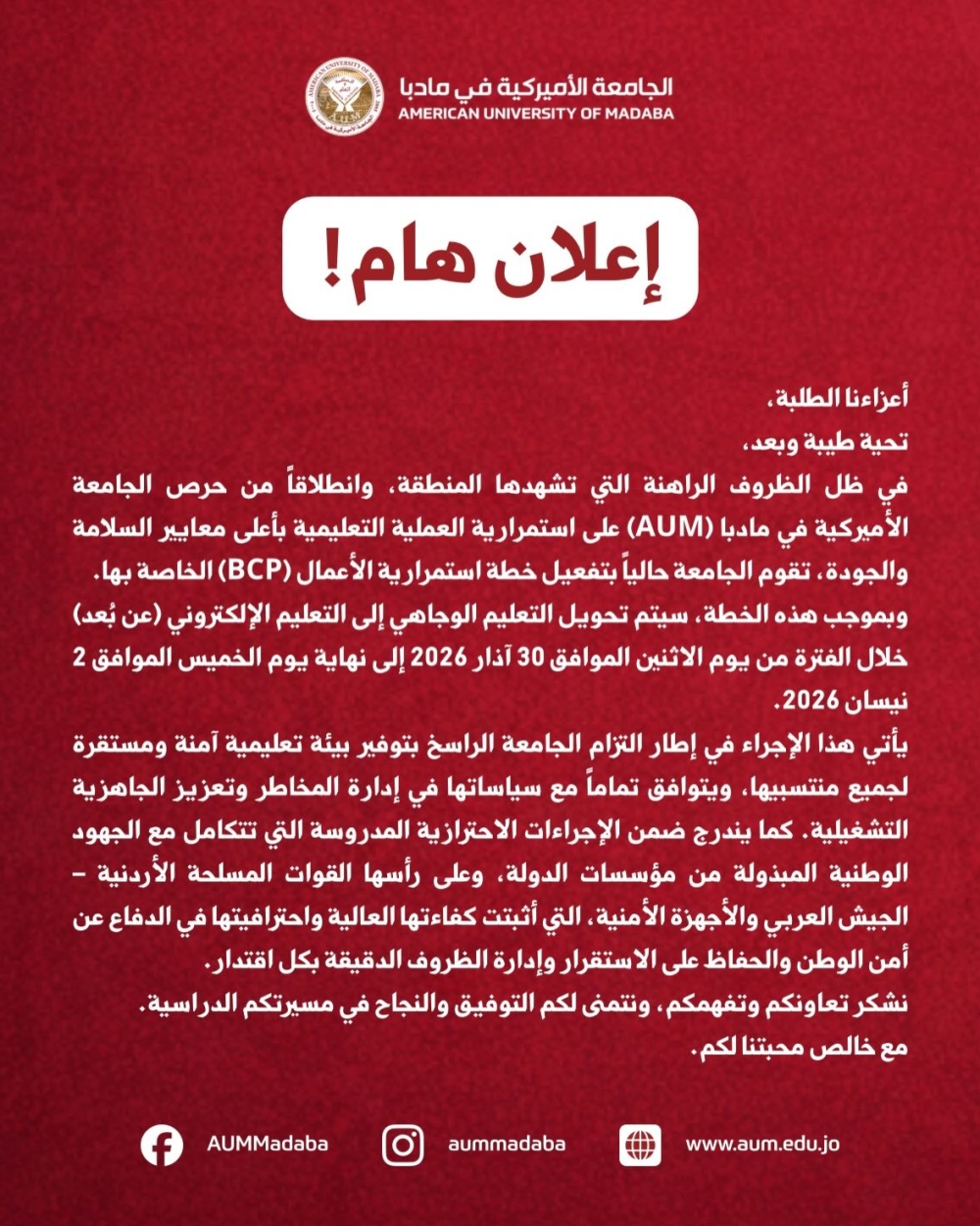 أعلنت الجامعة الأمريكية في مادبا (AUM) عن تفعيل خطة استمرارية الأعمال (BCP) في ظل الظروف الراهنة التي تشهدها المنطقة، مؤكدة حرصها على ضمان استمرارية العملية التعليمية وفق أعلى معايير السلامة والجودة.
