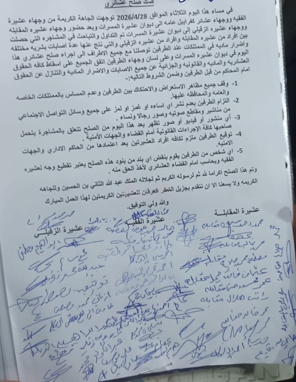 شهدت بلدة كفرابيل مساء الثلاثاء الموافق 2026/4/28 توقيع صك صلح عشائري شامل أنهى خلافا بين عشيرتي المقابلة والزقيلي، وذلك ضمن جهود مجتمعية واسعة قادها وجهاء المنطقة لاعادة الهدوء والاستقرار.