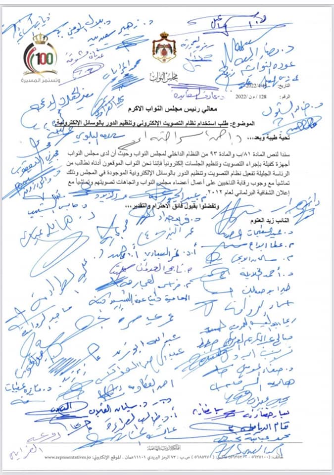 وأضاف النواب في مذكرتهم أن تفعيل إجراء التصويت وتنظيم الجلسات والدور إلكترونيا يأتي تماشيا مع وجوب رقابة الناخبين على اعمال اعضاء مجلس النواب واتجاهات تصويتهم ، وتماشيا مع اعلان الشفافية البرلماني لعام 2012 .